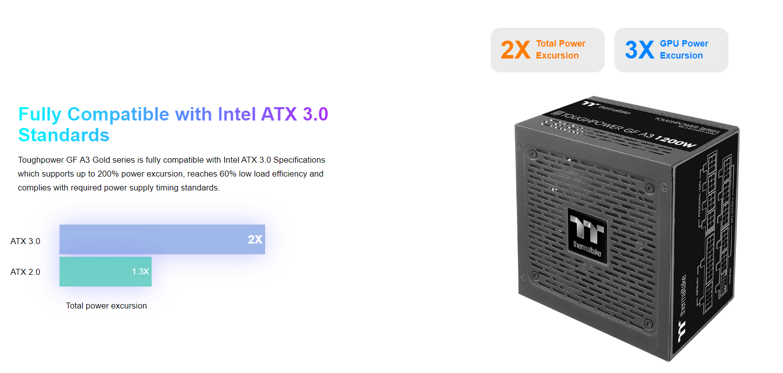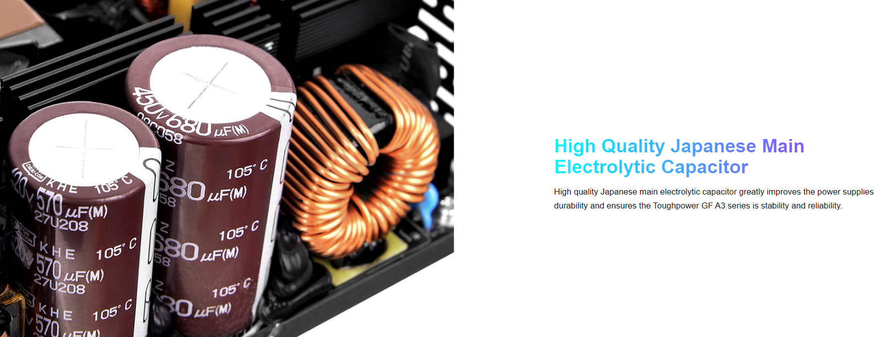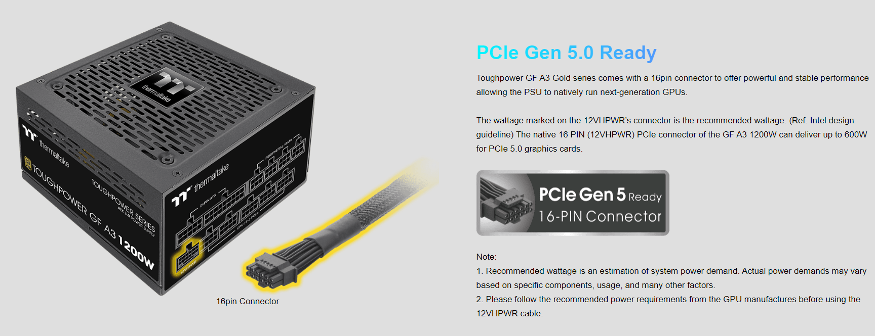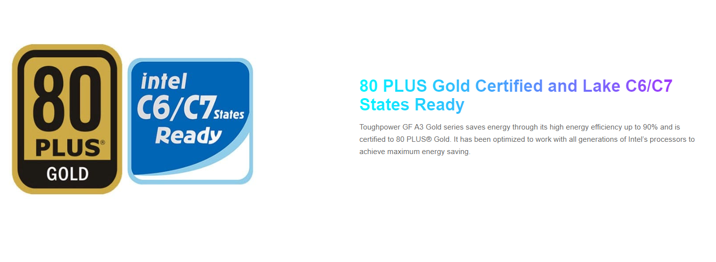 To fully support next-gen hardware, Toughpower GF A3 Gold Series (650W/750W/850W/1050W/1200W) is designed to meet ATX 3.0 standards, including a PCIe Gen 5.0 12VHPWR connector. The GF A3 Gold series delivers 80 PLUS Gold efficiency, it also offers stability, durability, and reliability.