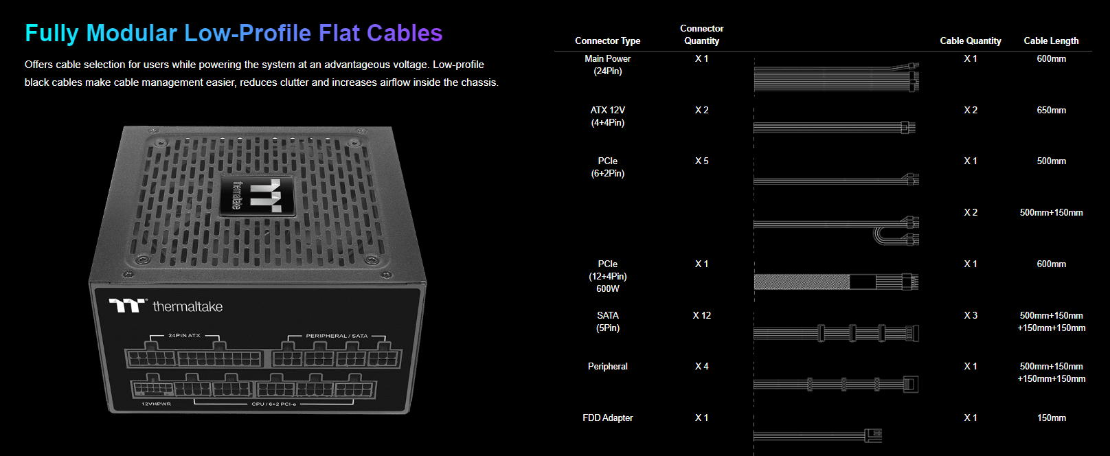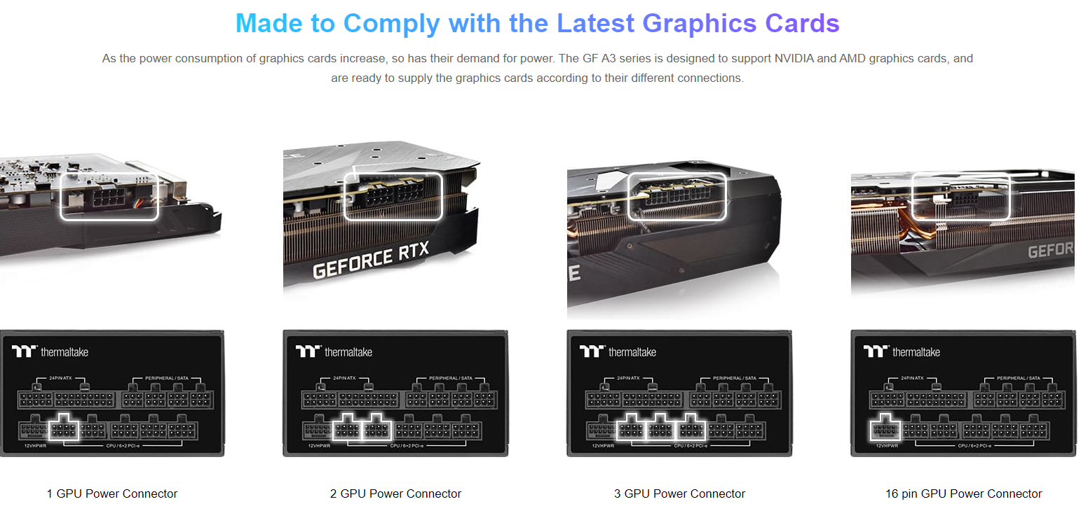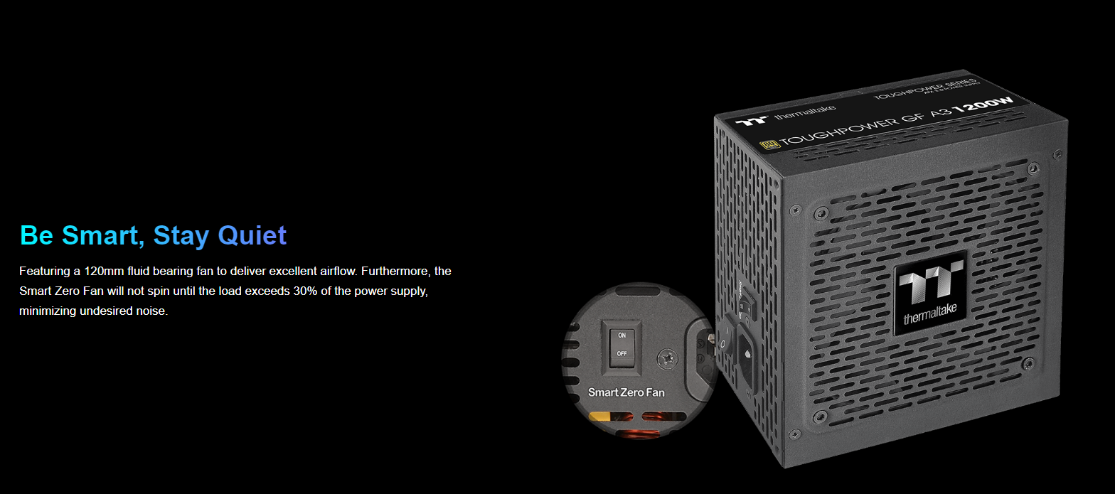 To fully support next-gen hardware, Toughpower GF A3 Gold Series (650W/750W/850W/1050W/1200W) is designed to meet ATX 3.0 standards, including a PCIe Gen 5.0 12VHPWR connector. The GF A3 Gold series delivers 80 PLUS Gold efficiency, it also offers stability, durability, and reliability.
