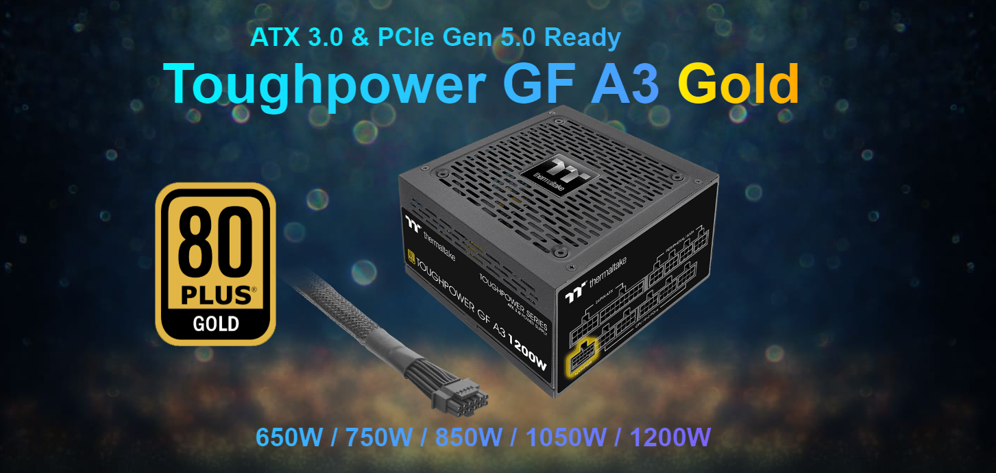 To fully support next-gen hardware, Toughpower GF A3 Gold Series (650W/750W/850W/1050W/1200W) is designed to meet ATX 3.0 standards, including a PCIe Gen 5.0 12VHPWR connector. The GF A3 Gold series delivers 80 PLUS Gold efficiency, it also offers stability, durability, and reliability.