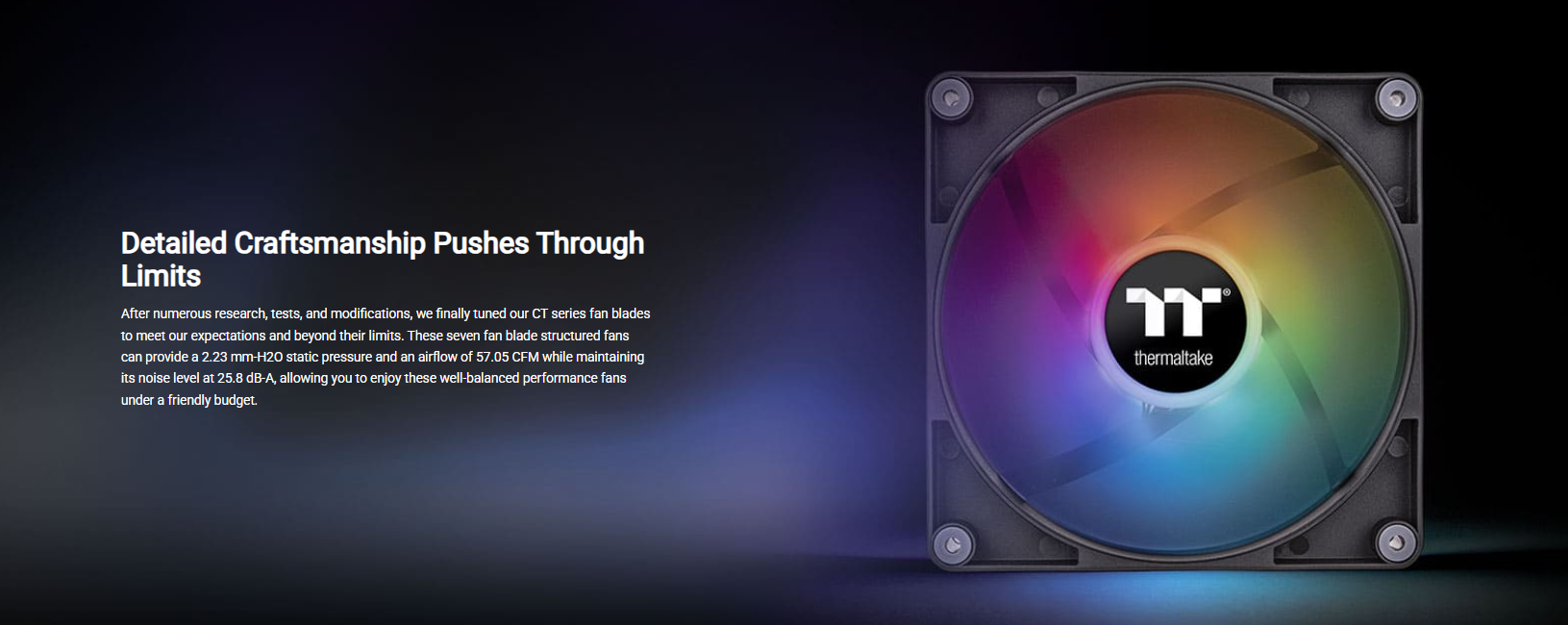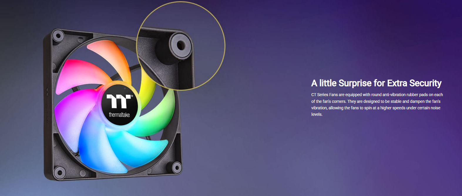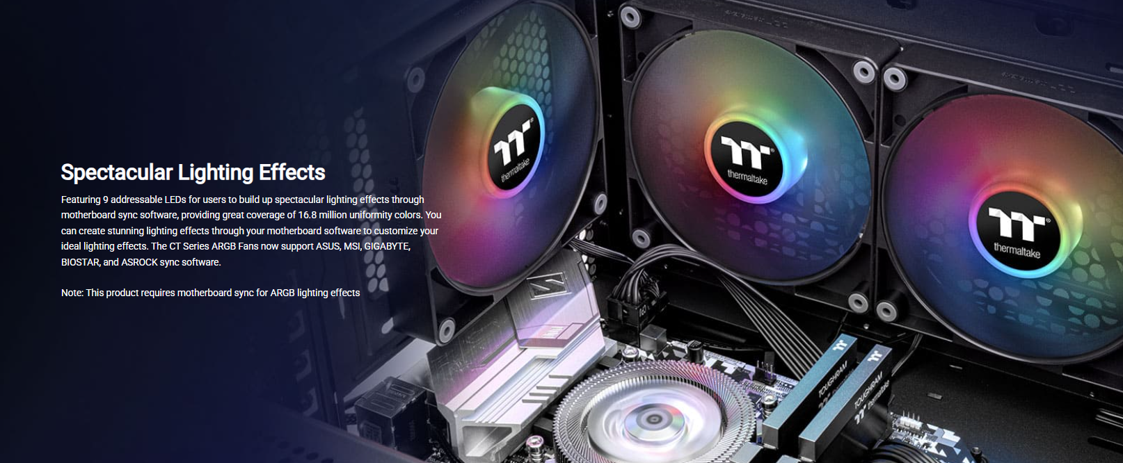 CT120 ARGB Sync PC Cooling Fans are Thermaltake’s new generation PWM fans designed to fit all PC usage scenarios. The CT Series Fans have a fan speed of 2000 RPM and are made with specially tuned fan blades that can push the air further. The new Cable-Integrated Daisy-Chain Design provides more flexibility in cable management, and its 9 addressable LEDs can be controlled through motherboard sync software for spectacular lighting effects.