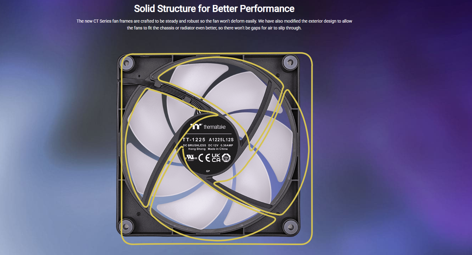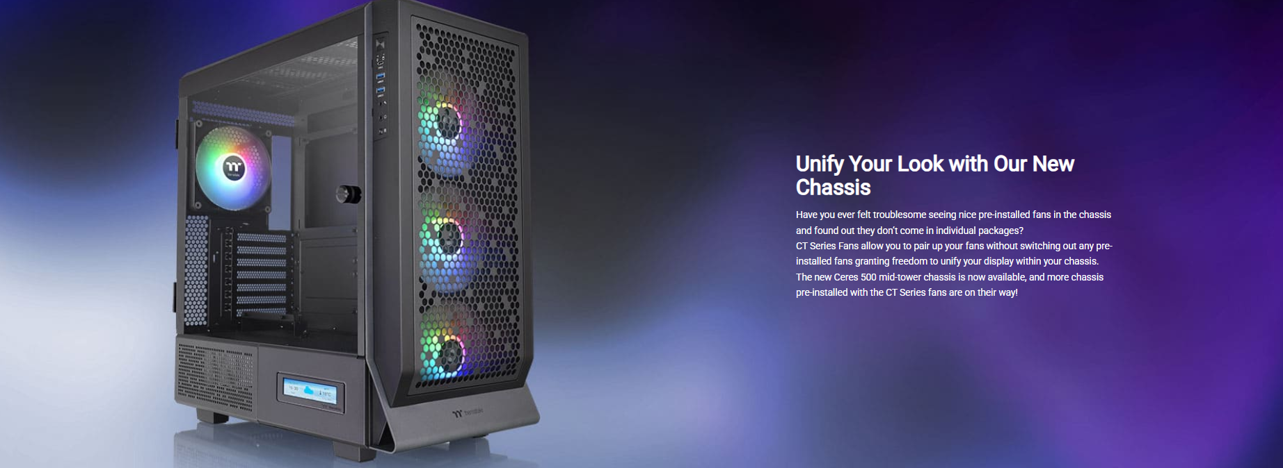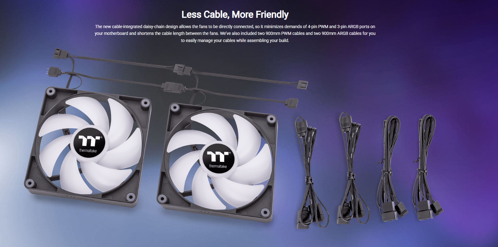 CT120 ARGB Sync PC Cooling Fans are Thermaltake’s new generation PWM fans designed to fit all PC usage scenarios. The CT Series Fans have a fan speed of 2000 RPM and are made with specially tuned fan blades that can push the air further. The new Cable-Integrated Daisy-Chain Design provides more flexibility in cable management, and its 9 addressable LEDs can be controlled through motherboard sync software for spectacular lighting effects.