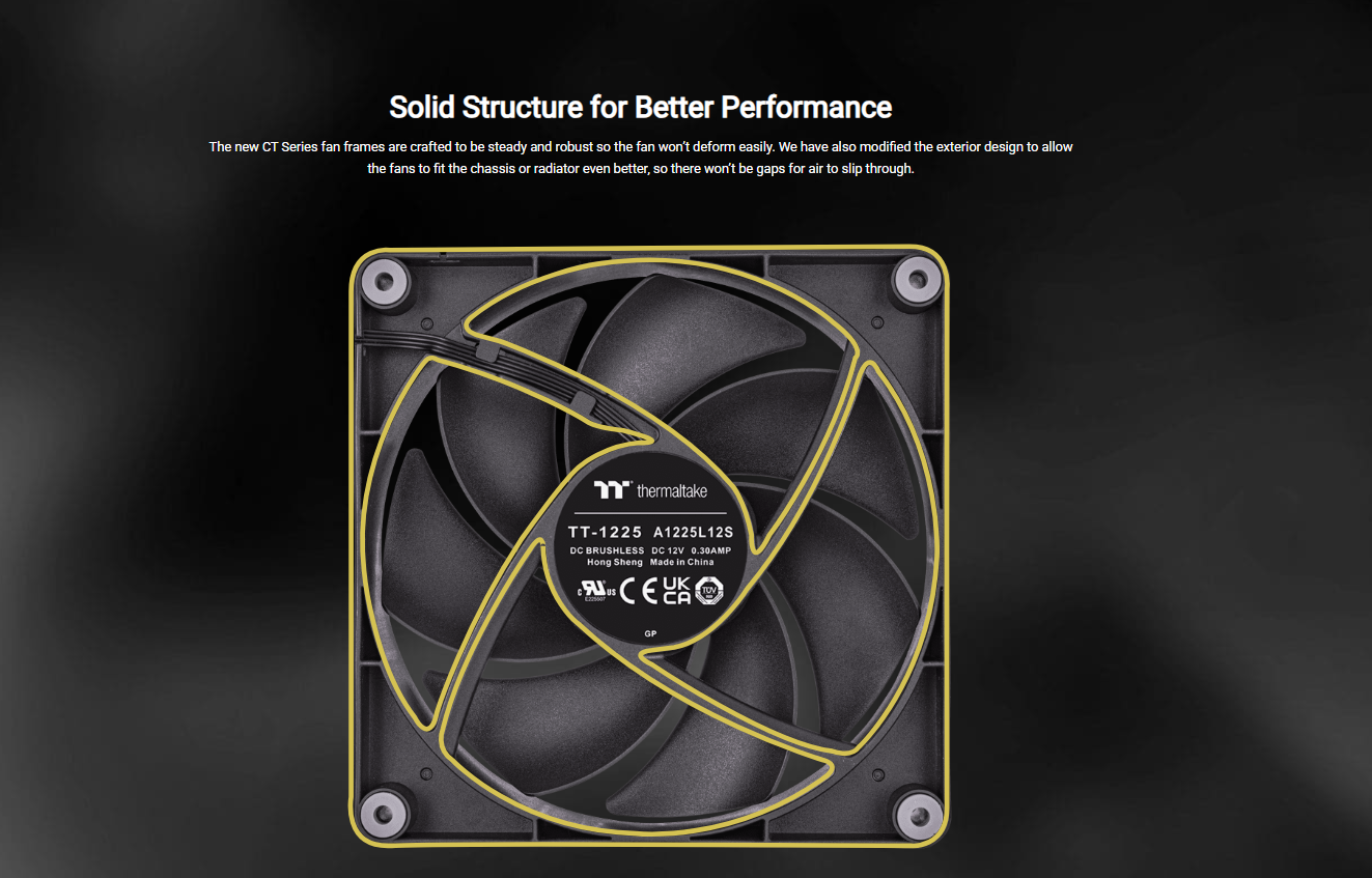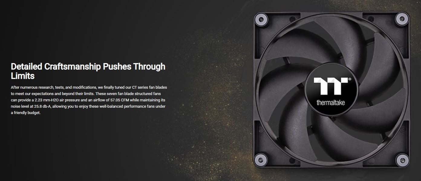 CT120 PC Cooling Fans are Thermaltake’s new generation PWM fans designed to fit all PC usage scenarios. The CT Series Fans have a fan speed of 2000 RPM and are made with specially tuned fan blades that can push the air further. The new Cable-Integrated Daisy-Chain Design provides more flexibility in cable management.