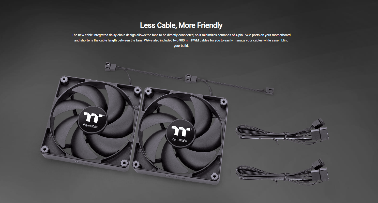 CT140 PC Cooling Fans are Thermaltake’s new generation PWM fans designed to fit all PC usage scenarios. The CT Series Fans have a fan speed of 1500 RPM and are made with specially tuned fan blades that can push the air further. The new Cable-Integrated Daisy-Chain Design provides more flexibility in cable management.