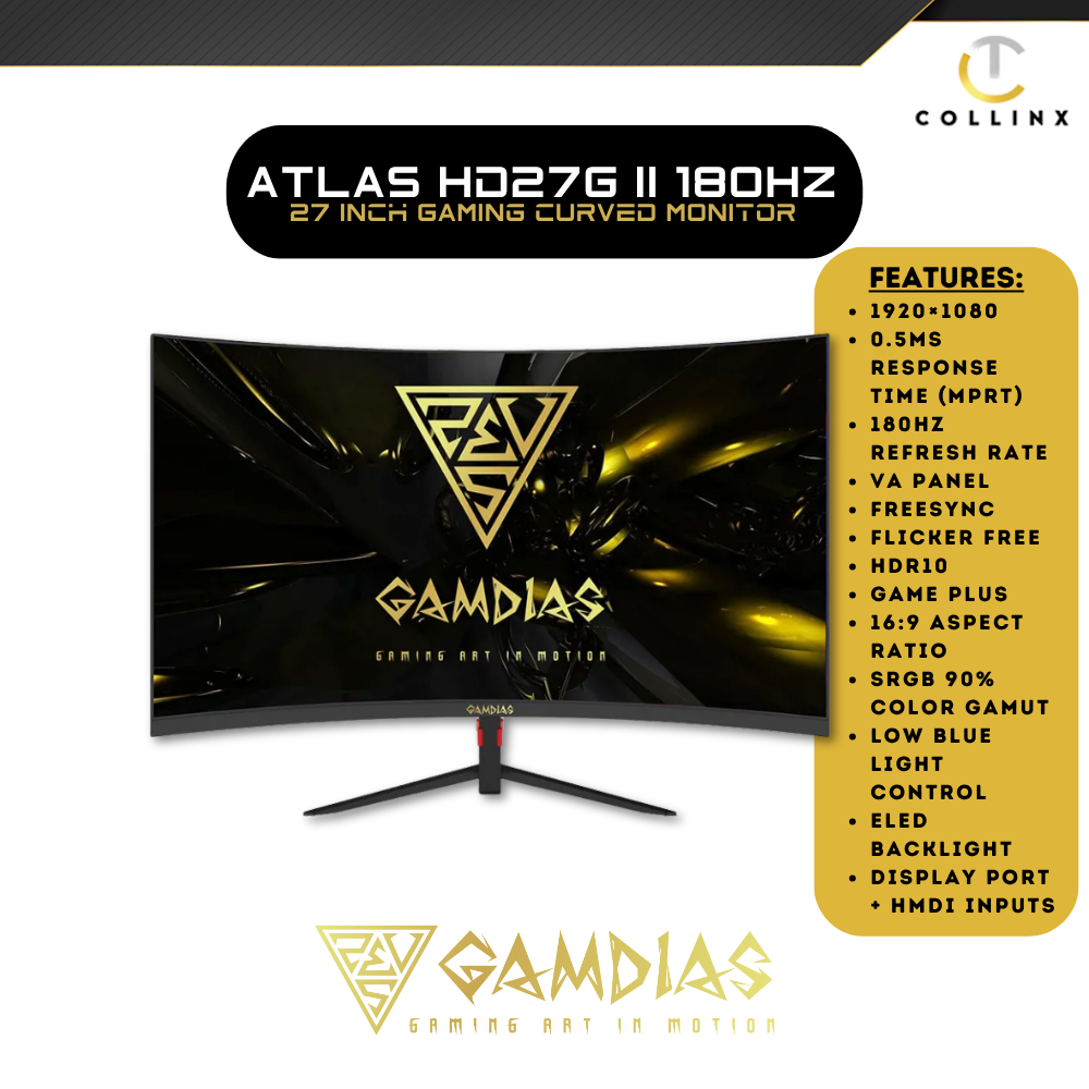 The Gamdias Atlas HD27G II is a premium 27-inch Full HD curved gaming monitor designed for immersive gaming and stunning visuals. Featuring an R1500 curvature, this monitor wraps around your field of view for a more natural and engaging experience. Its ultra-fast 180Hz refresh rate combined with a 0.5ms MPRT response time ensures silky-smooth motion and razor-sharp visuals, perfect for fast-paced action games. With HDR10 support and a 90% sRGB color gamut, this monitor delivers breathtaking color accuracy and dynamic contrast for true-to-life images. The Fast VA panel offers deep blacks, vibrant colors, and a 3000:1 static contrast ratio, making every frame pop. Equipped with features like FreeSync for tear-free gameplay, FPS/RTS Game Mode, and Low Blue Light Control, the Atlas HD27G II is built for long gaming sessions without compromising eye comfort. Its sleek black design, versatile connectivity options, and ergonomic tilt adjustment make it a standout choice for any gaming setup.