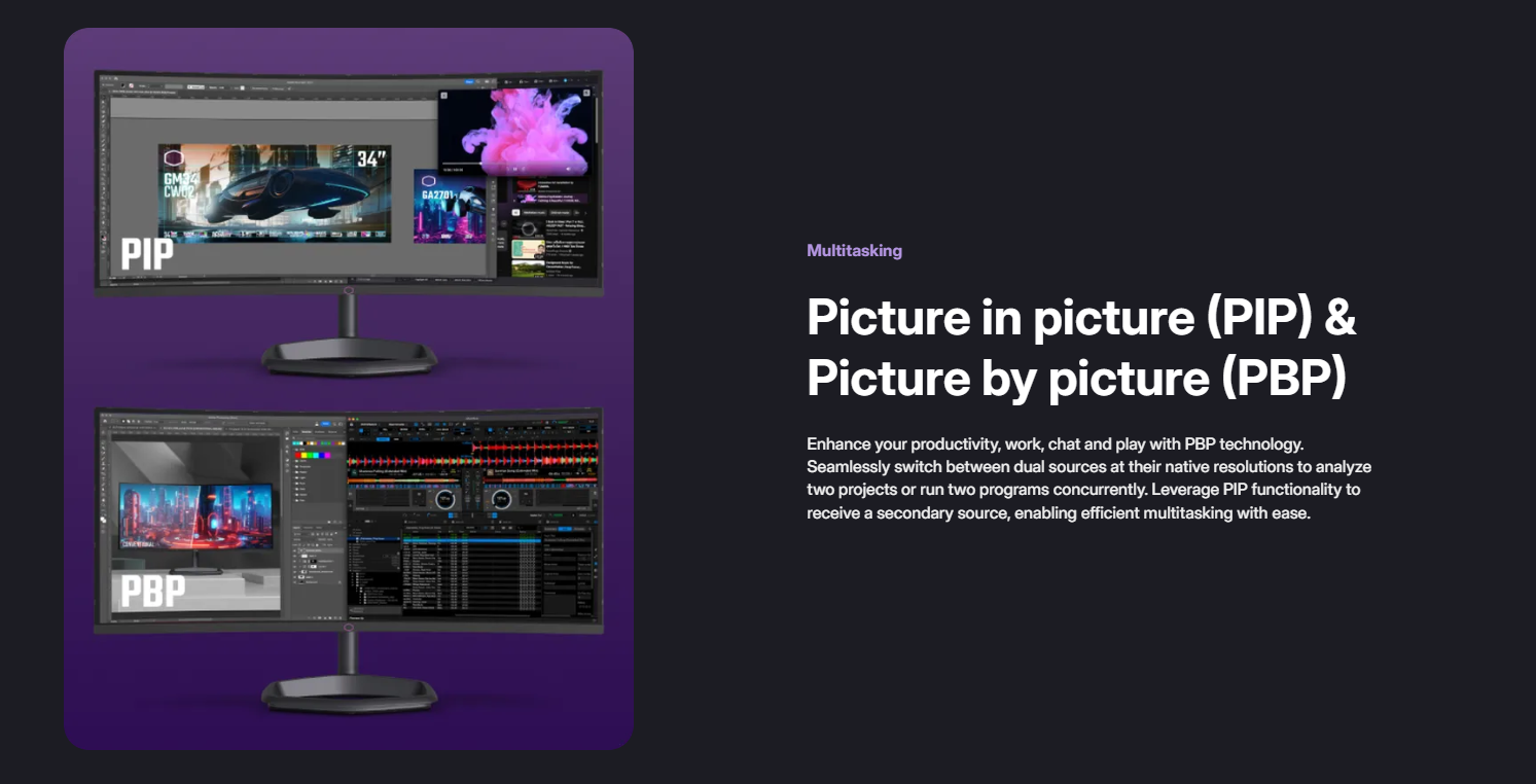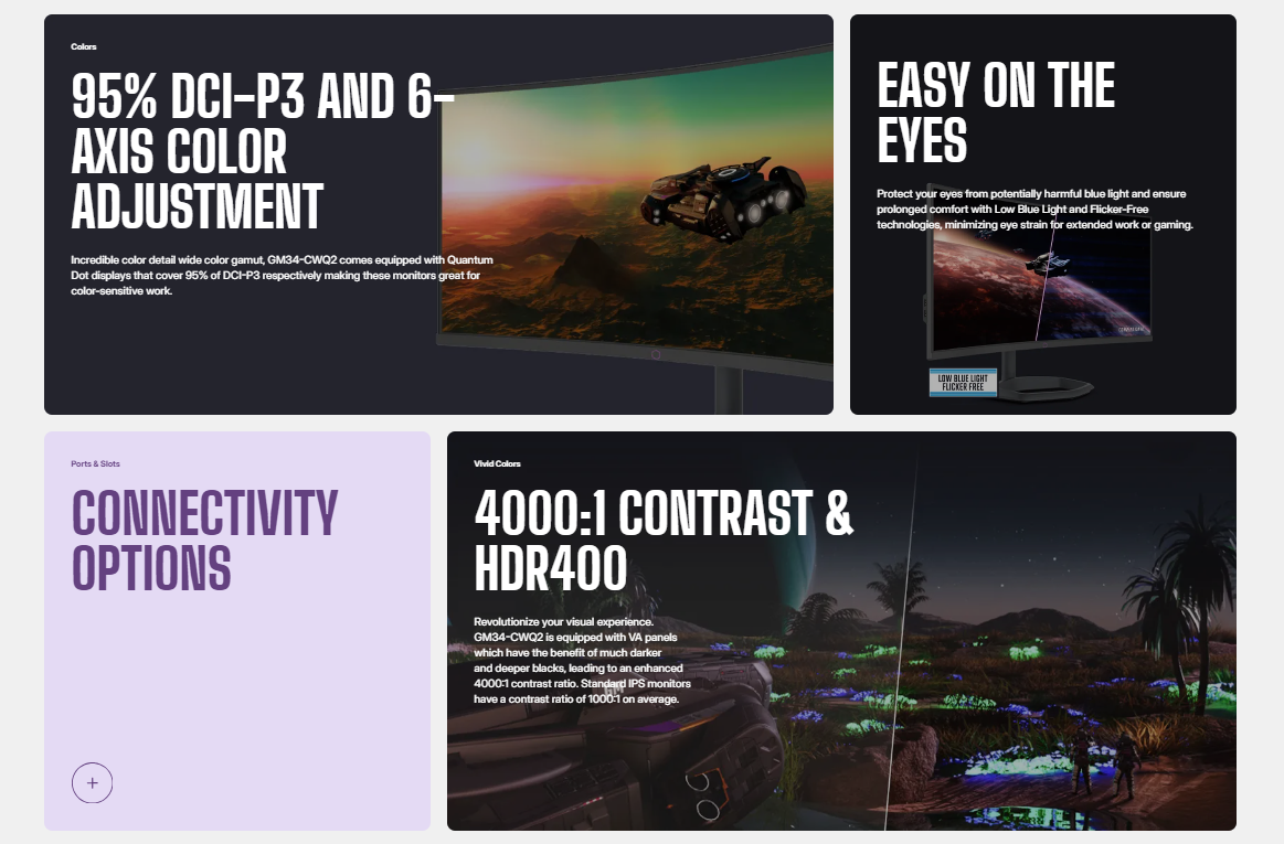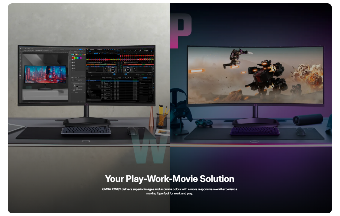 The GM34-CWQ2 is meticulously crafted for universal appeal, delivering exceptional value and performance. With its UWQHD resolution and a Quantum Dot panel, it enriches your work and play experiences by offering a wide DCI-P3 color gamut, all seamlessly displayed at a remarkable 180Hz refresh rate.