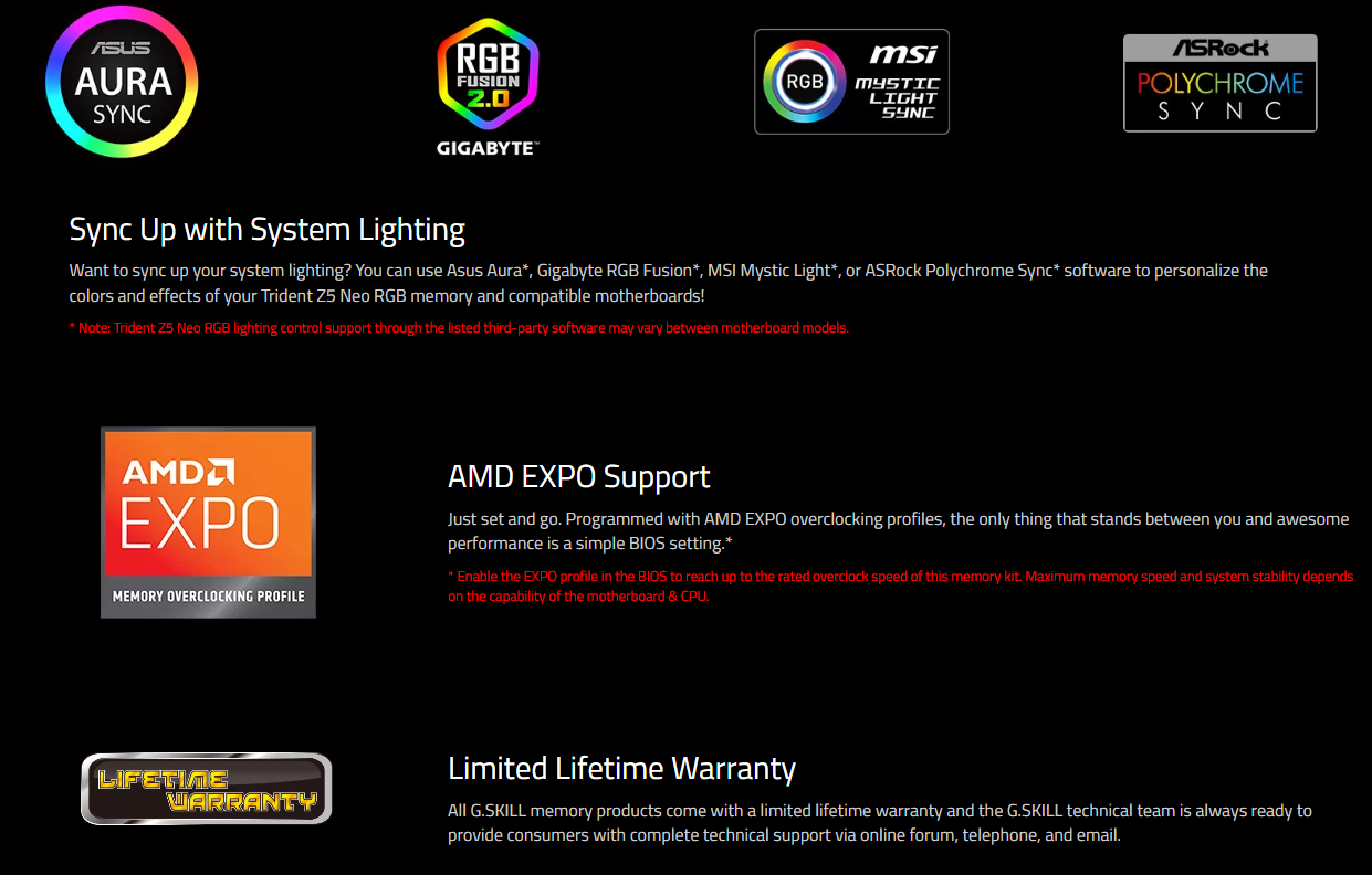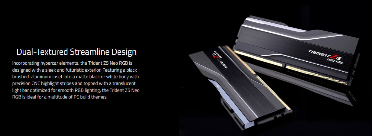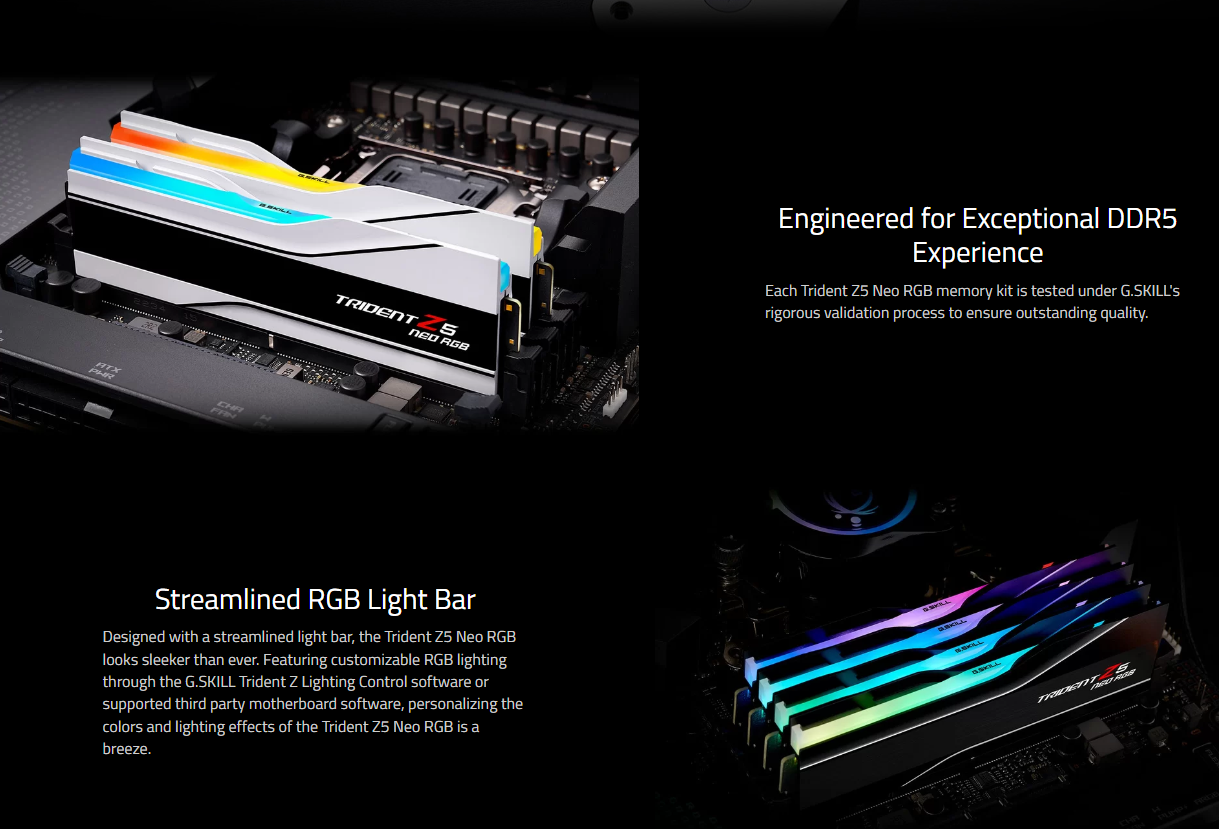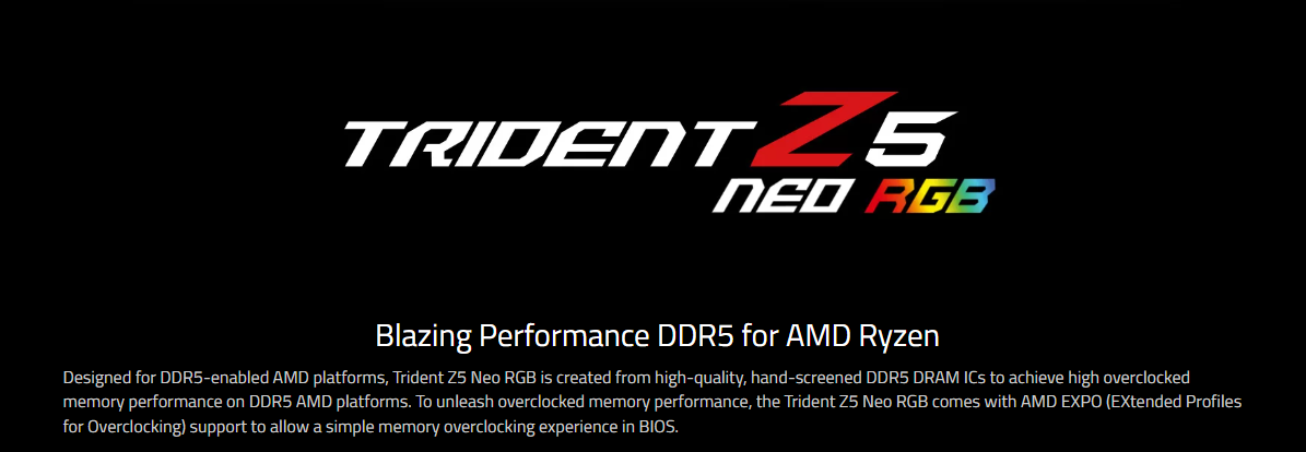Trident Z5 Neo RGB DDR5 memory is designed for ultra-high overclocked performance on DDR5-enabled AMD platforms. Featuring AMD EXPO overclocking technology for easy memory overclocking on supported AMD platforms, the Trident Z5 Neo RGB series is the ideal choice for building high-performance systems.