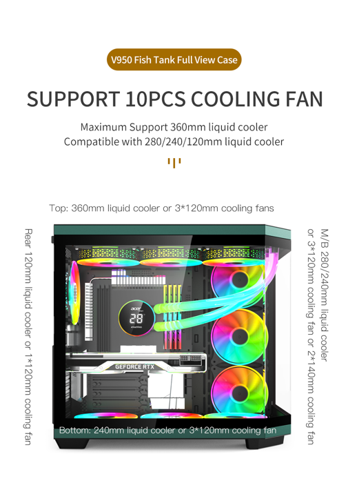 Mother board : 3*12cm fans or 2*140mm or 240mm /280mm Liquid cooler; Bottom:3*120mm fans or 240mm water cooler; Rear:1*120mm fan or 120mm liquid cooler; |