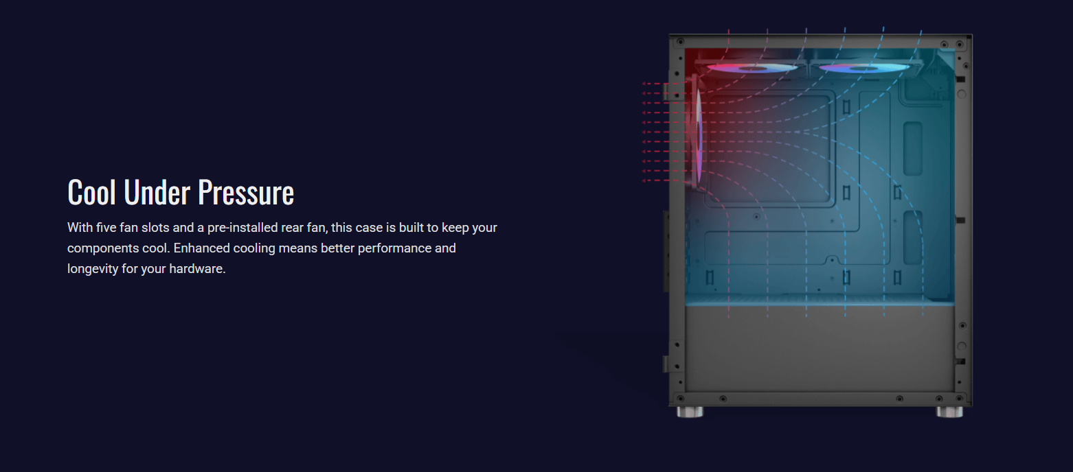 Enhanced Cooling – Includes five total fan slots (top and PSU shroud) and a pre-installed rear fan for impressive cooling potential.