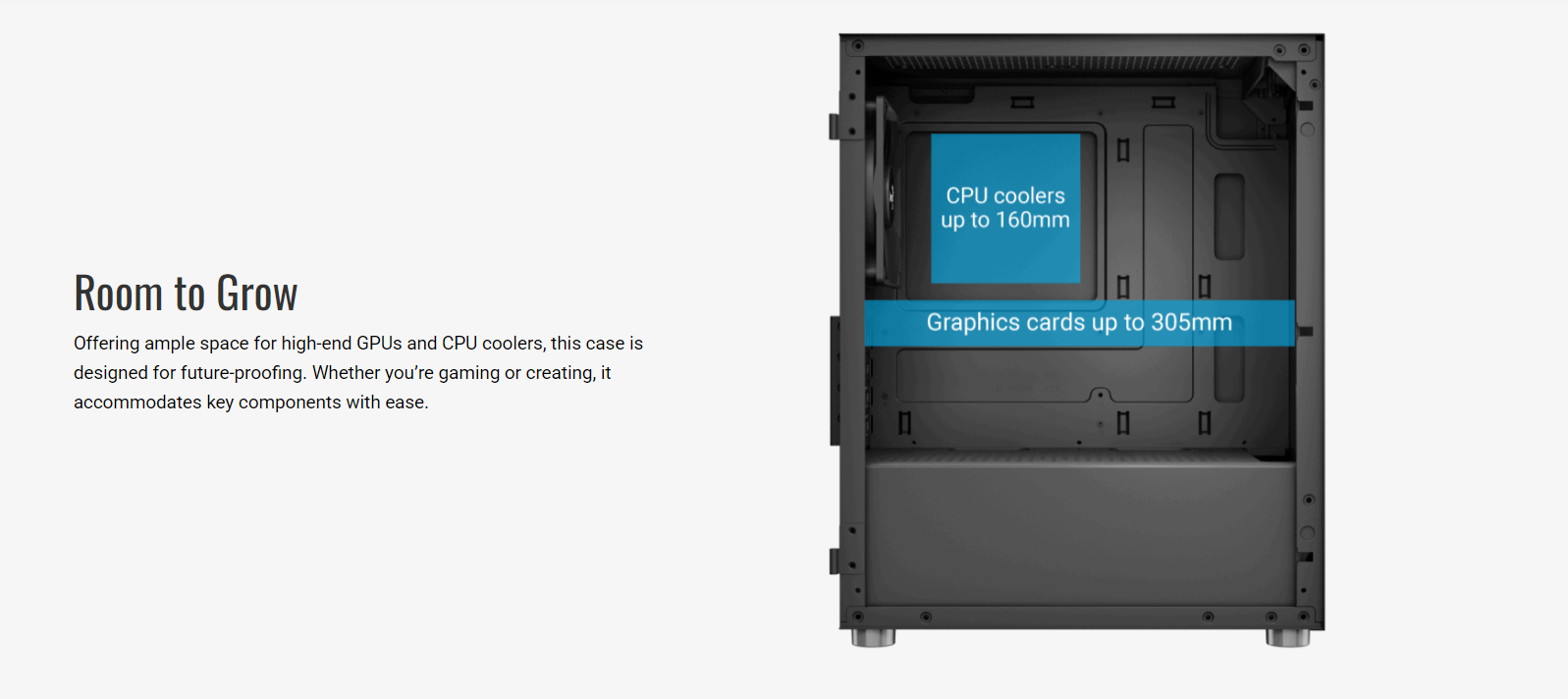 GPU and CPU Clearance – Accommodates GPUs up to 305mm and CPU coolers up to 160mm.