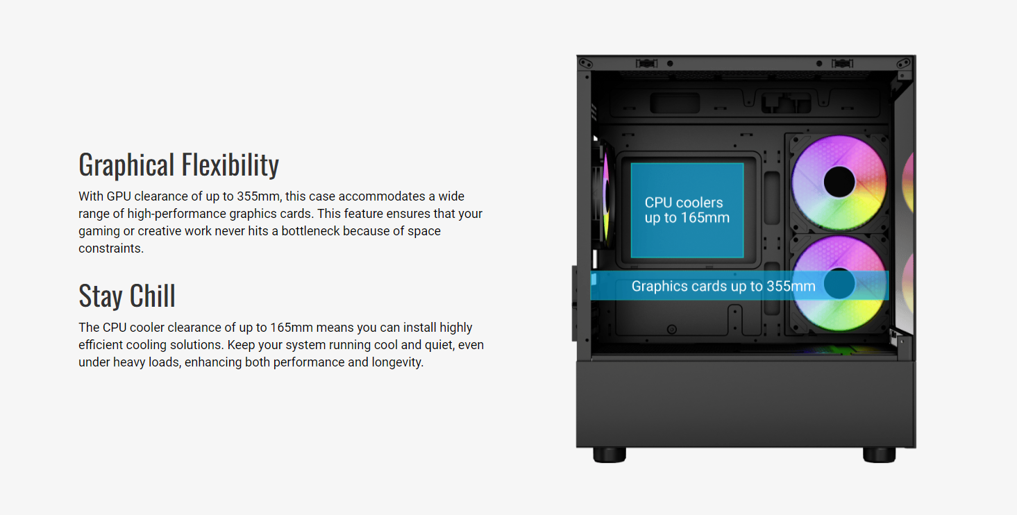 • CPU Cooler Clearance: Up to 165mm – Compatible with efficient cooling solutions.