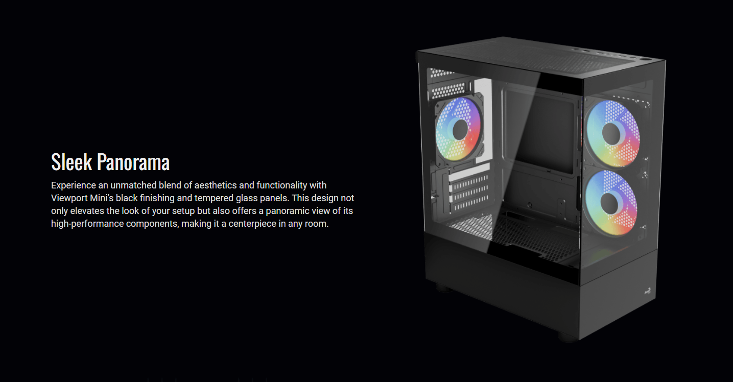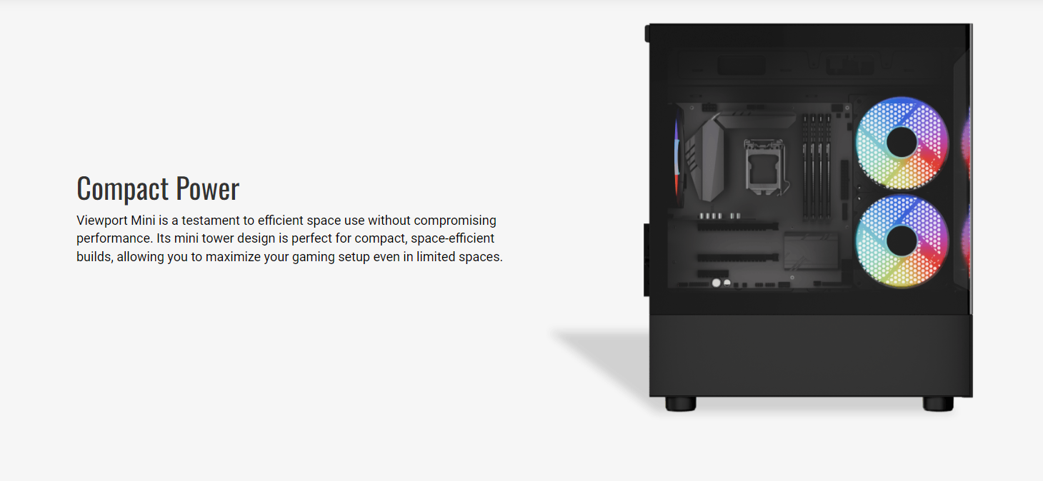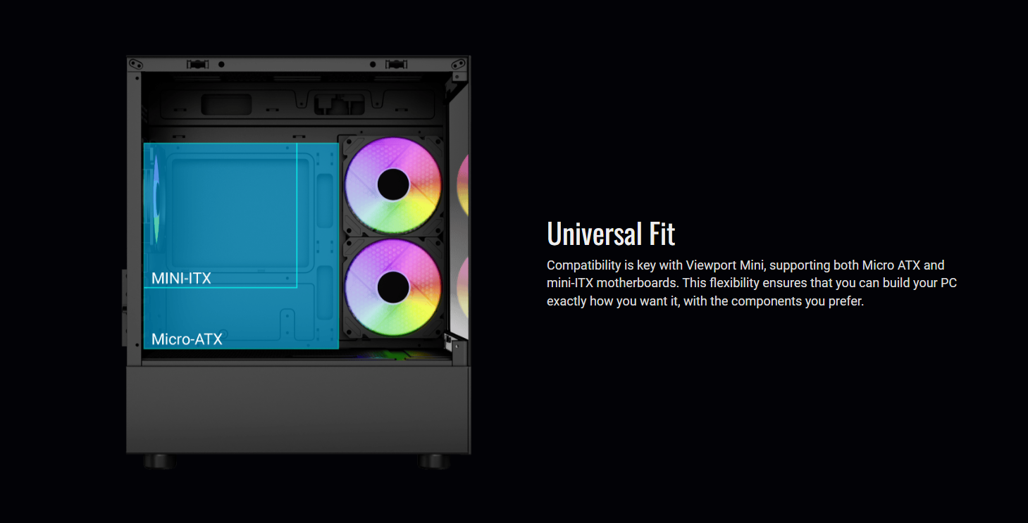 Viewport Mini is a mini tower PC case with tempered glass front and side panels for a panoramic view, showing off its powerful internals. It supports Micro ATX and mini-ITX motherboards and features advanced cooling options, with 7 fan slots and liquid cooling for 240/280mm and 120mm radiators. Included FRGB or ARGB fans intake air through mesh ventilation to optimize airflow. Ideal for gaming and high-performance use, it accommodates GPUs up to 355mm and CPU coolers up to 165mm.