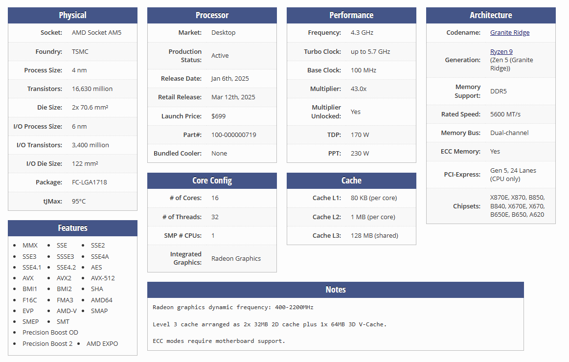 With a TDP of 170 W, the Ryzen 9 9950X3D is extremely power hungry, which means you need top-notch cooling. AMD’s processor supports DDR5 memory with a dual-channel interface. The highest officially supported memory speed is 5600 MT/s, but with overclocking (and the right memory modules) you can go even higher. ECC memory is supported, too, which is an important capability for mission-critical systems, to avoid data corruption. For communication with other components in the computer, Ryzen 9 9950X3D uses a PCI-Express Gen 5 connection. This processor features the Radeon Graphics integrated graphics solution.