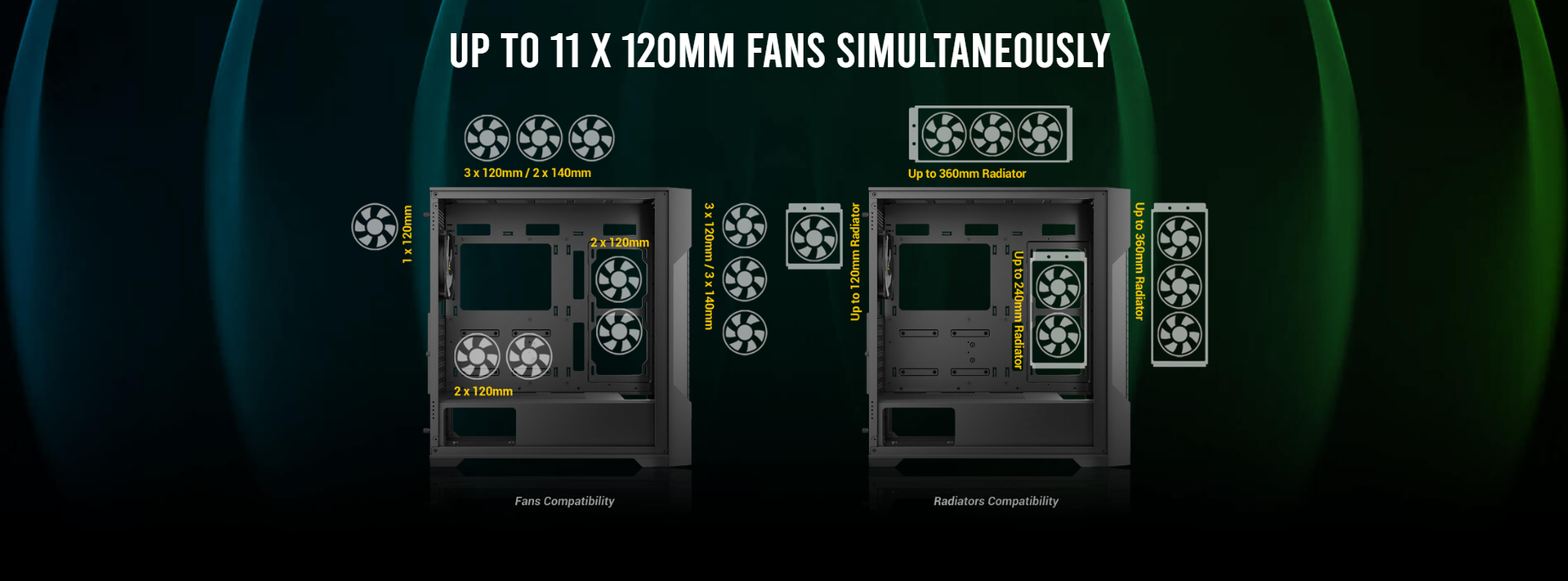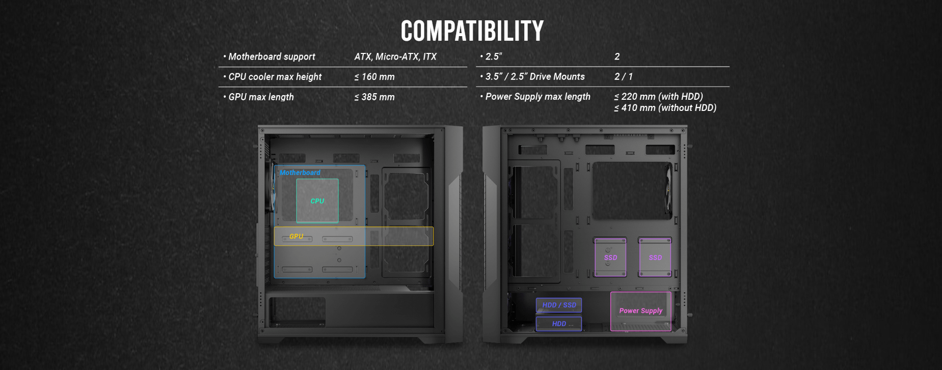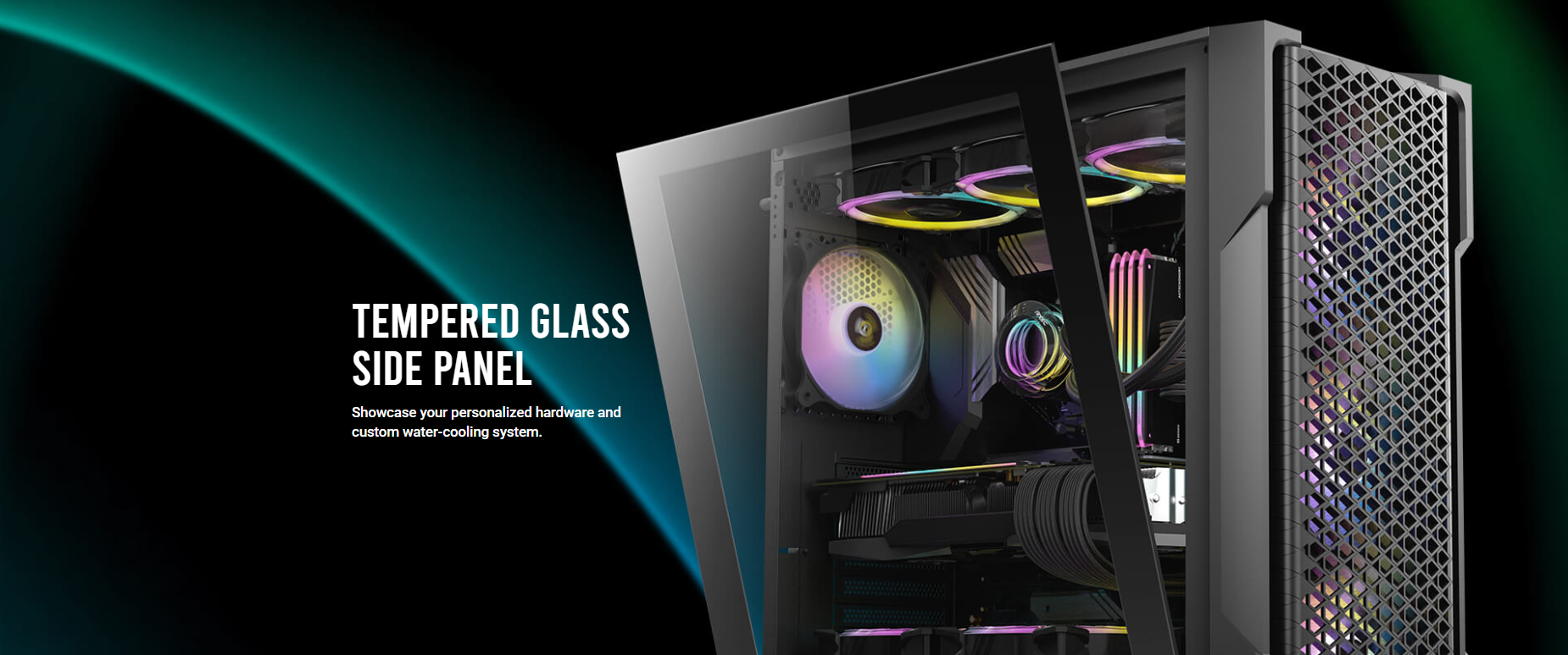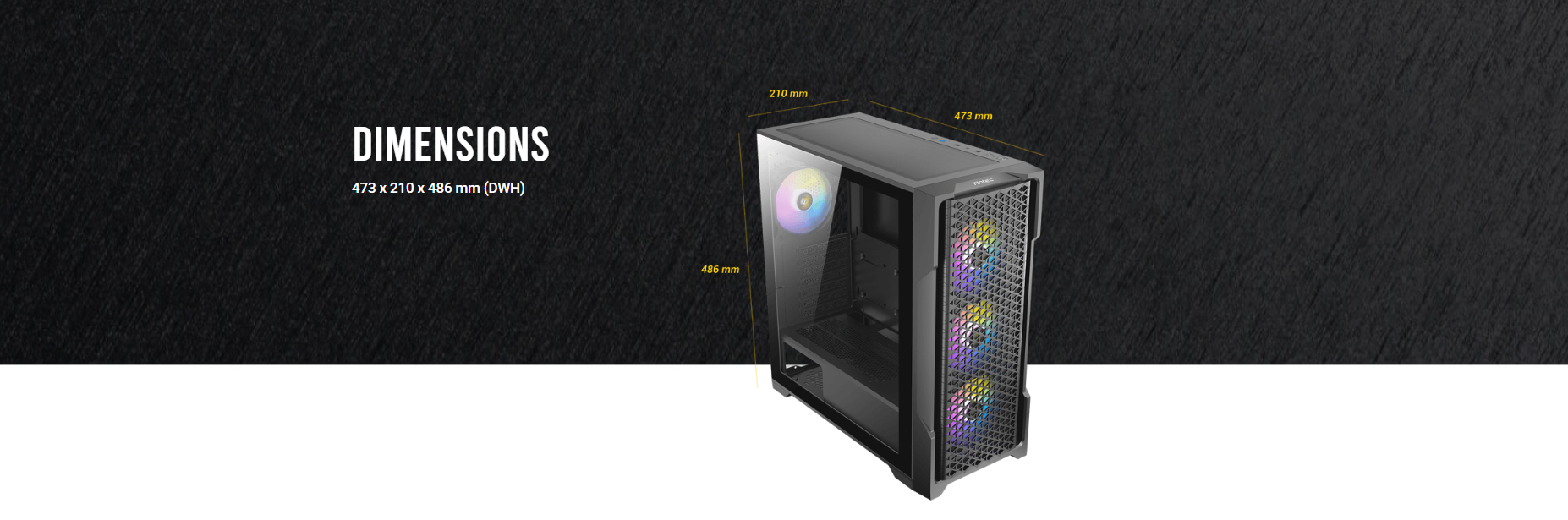 Dimensions : 473 x 210 x 486 mm (DxWxH) Form Factor : Mid Tower Materials : Steel+ Plastic Main board Support : ATX, Micro-ATX, ITX Front Access & Controls : Power, Reset, LED Control Button, C!O Side Panel Expansion Slots Cooling Support O· Radiator Support 1 x USB3.0, 2 x USB2.0, MIC/HD-AU : 4mm Tempered Glass : 7; Drive bays: 3.5″ I 2.5″ x 2 I 1 ; 2.5″ X 2 : Front: 3x 120/ 3x 140mm; Top: 3 x 120 / 2 x 140mm; PSU Shroud : 2 x 1 2 Side: 2 x 120mm; Rear: lx120 : Front : 120 /140 /240 /280 / 360mm; Top: 120 / 140 / 240 / 280 / 360mm; Side : 1201240mm Rear: 120mm Max GPU Length : ::; 385mm Max CPU Cooler Height: ::; 160mm PSU Support : s 220mm ( with HDD) Dust Filter Gross Weight s 410mm ( without HDD) : Front / Top/ Bottom/ Right Hand Side : 7.93 Kg