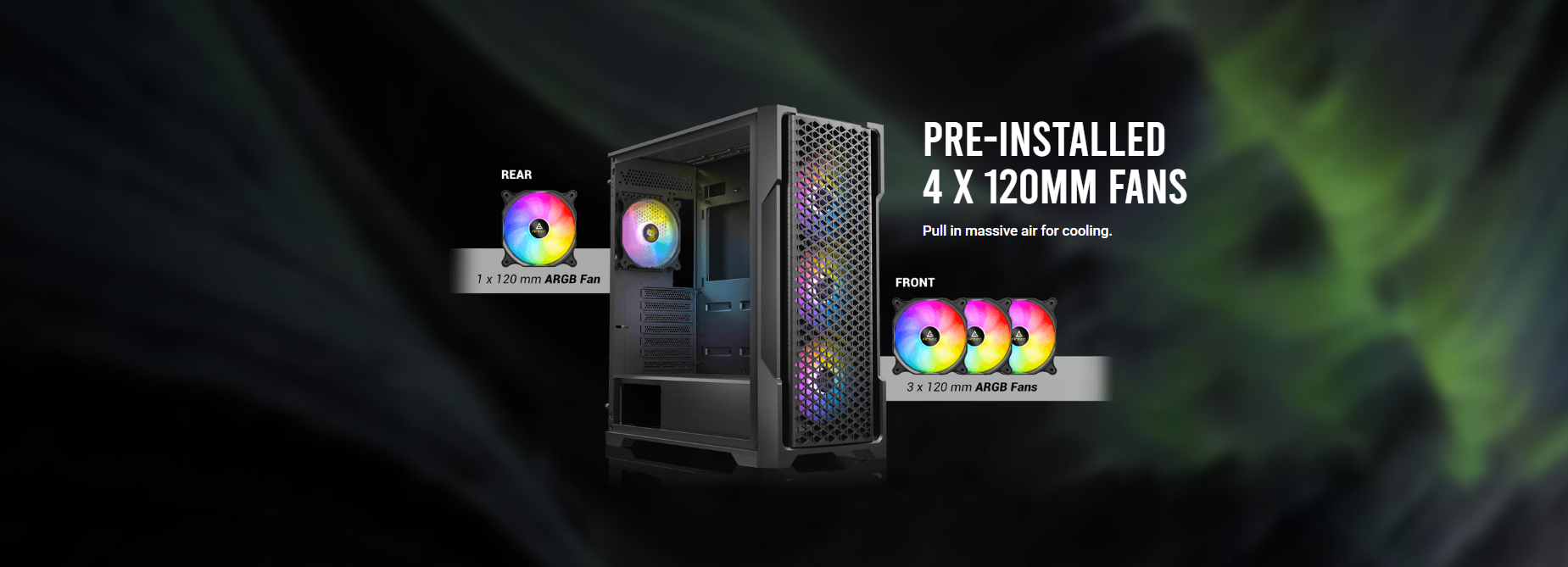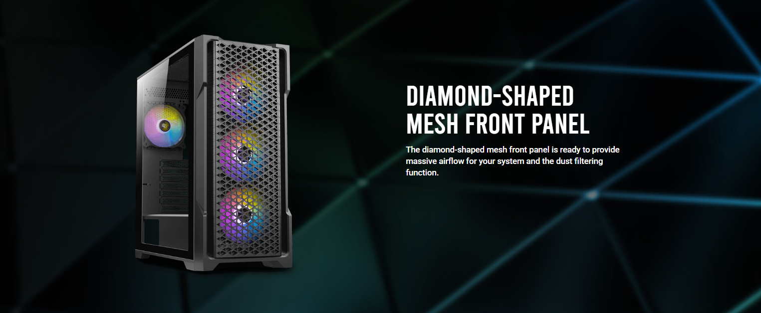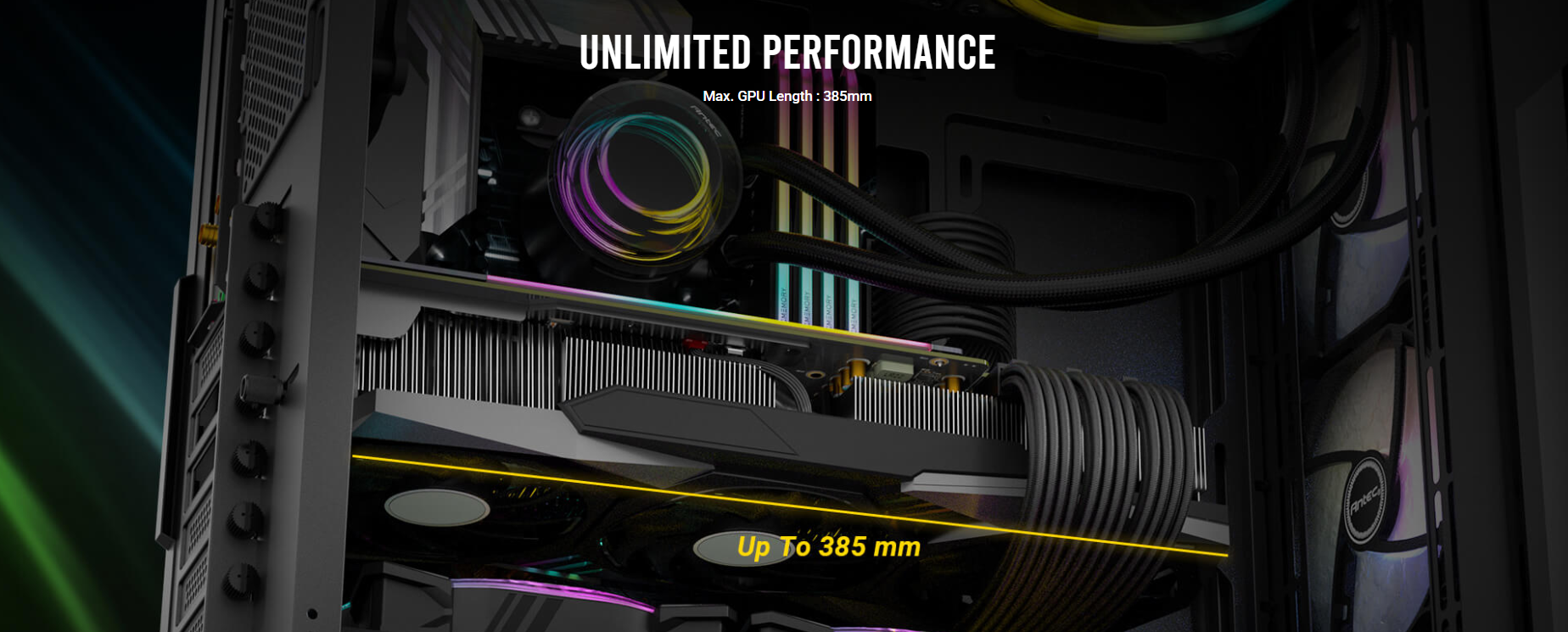 Dimensions : 473 x 210 x 486 mm (DxWxH) Form Factor : Mid Tower Materials : Steel+ Plastic Main board Support : ATX, Micro-ATX, ITX Front Access & Controls : Power, Reset, LED Control Button, C!O Side Panel Expansion Slots Cooling Support O· Radiator Support 1 x USB3.0, 2 x USB2.0, MIC/HD-AU : 4mm Tempered Glass : 7; Drive bays: 3.5″ I 2.5″ x 2 I 1 ; 2.5″ X 2 : Front: 3x 120/ 3x 140mm; Top: 3 x 120 / 2 x 140mm; PSU Shroud : 2 x 1 2 Side: 2 x 120mm; Rear: lx120 : Front : 120 /140 /240 /280 / 360mm; Top: 120 / 140 / 240 / 280 / 360mm; Side : 1201240mm Rear: 120mm Max GPU Length : ::; 385mm Max CPU Cooler Height: ::; 160mm PSU Support : s 220mm ( with HDD) Dust Filter Gross Weight s 410mm ( without HDD) : Front / Top/ Bottom/ Right Hand Side : 7.93 Kg