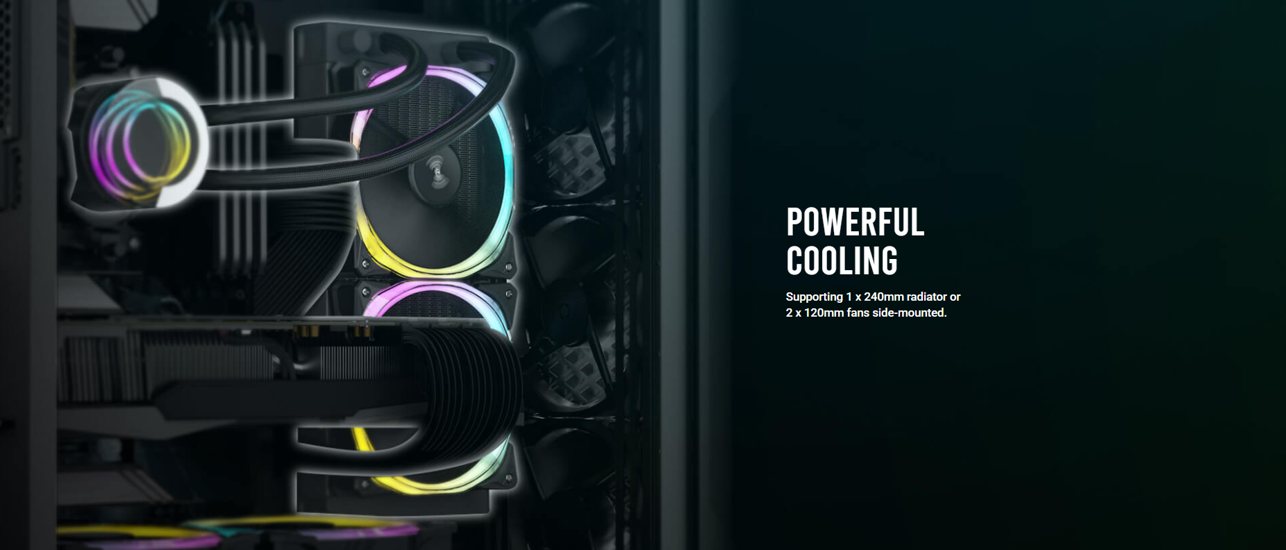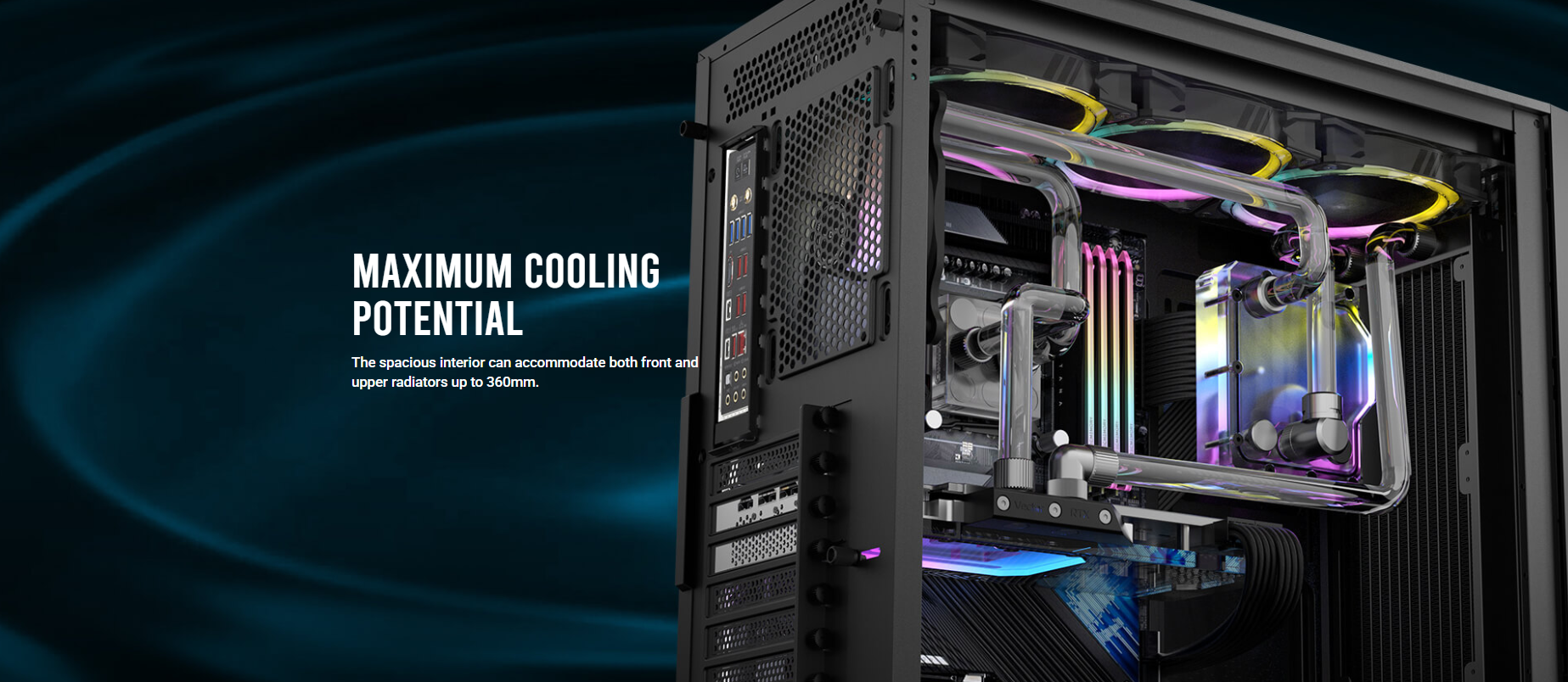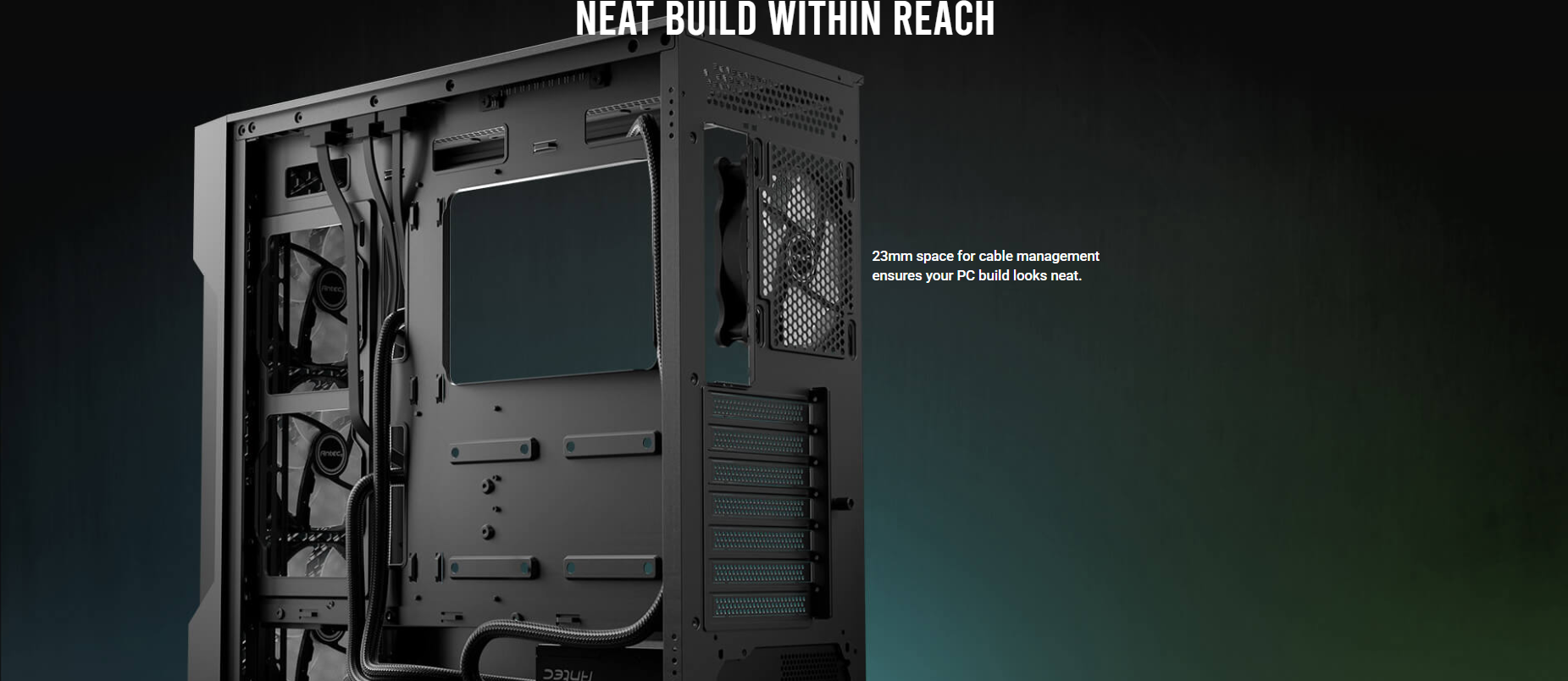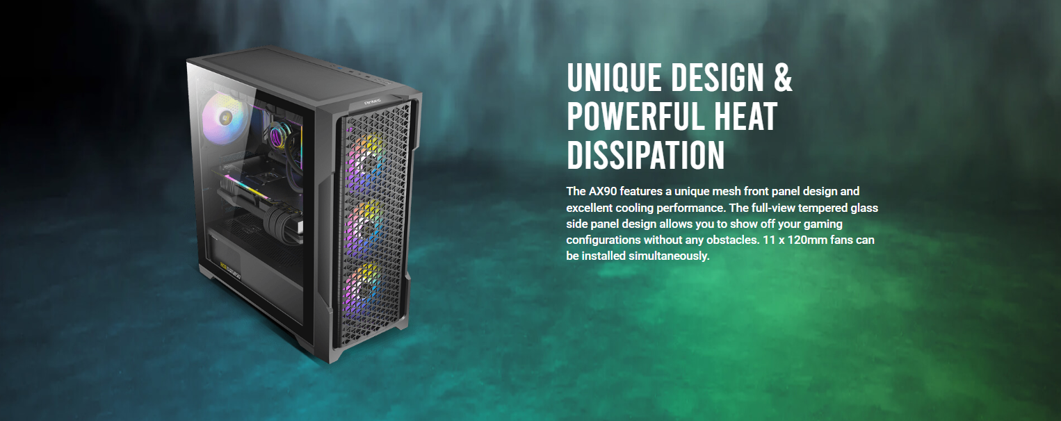 Dimensions : 473 x 210 x 486 mm (DxWxH) Form Factor : Mid Tower Materials : Steel+ Plastic Main board Support : ATX, Micro-ATX, ITX Front Access & Controls : Power, Reset, LED Control Button, C!O Side Panel Expansion Slots Cooling Support O· Radiator Support 1 x USB3.0, 2 x USB2.0, MIC/HD-AU : 4mm Tempered Glass : 7; Drive bays: 3.5″ I 2.5″ x 2 I 1 ; 2.5″ X 2 : Front: 3x 120/ 3x 140mm; Top: 3 x 120 / 2 x 140mm; PSU Shroud : 2 x 1 2 Side: 2 x 120mm; Rear: lx120 : Front : 120 /140 /240 /280 / 360mm; Top: 120 / 140 / 240 / 280 / 360mm; Side : 1201240mm Rear: 120mm Max GPU Length : ::; 385mm Max CPU Cooler Height: ::; 160mm PSU Support : s 220mm ( with HDD) Dust Filter Gross Weight s 410mm ( without HDD) : Front / Top/ Bottom/ Right Hand Side : 7.93 Kg
