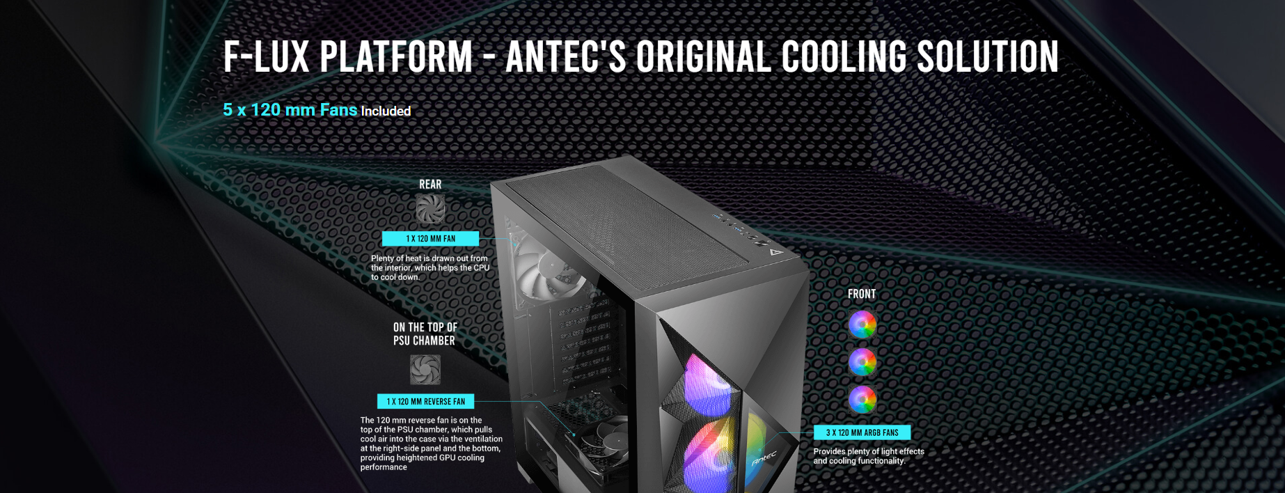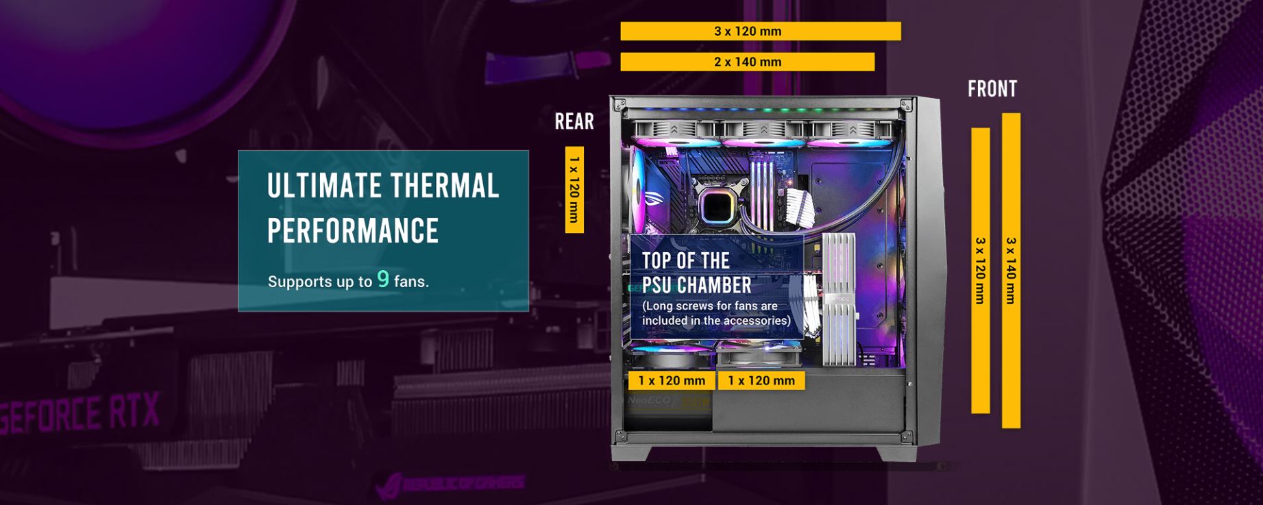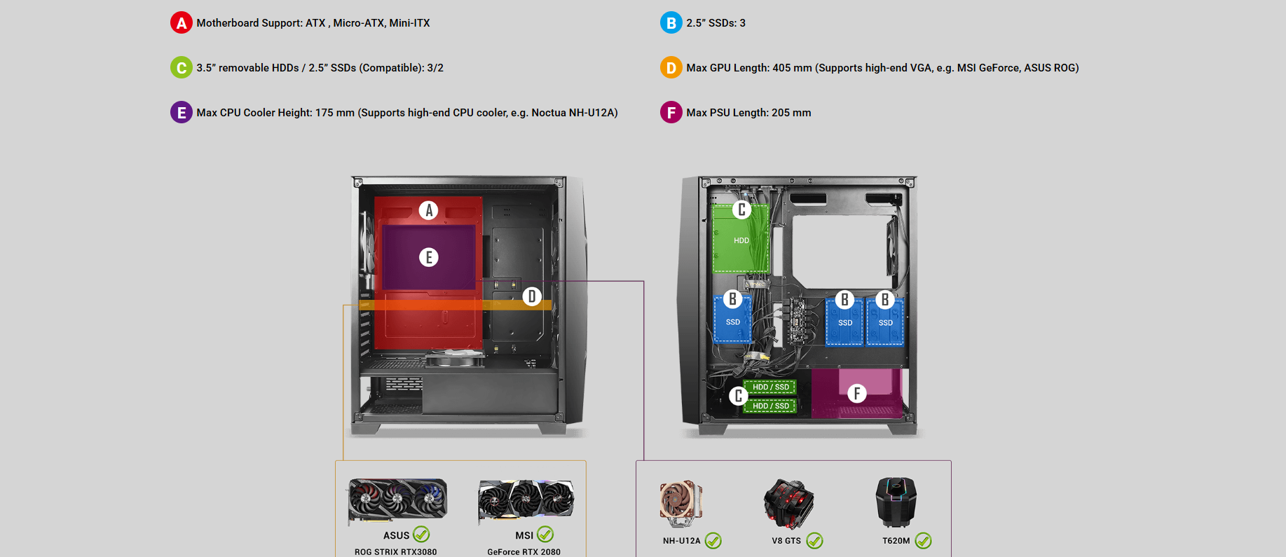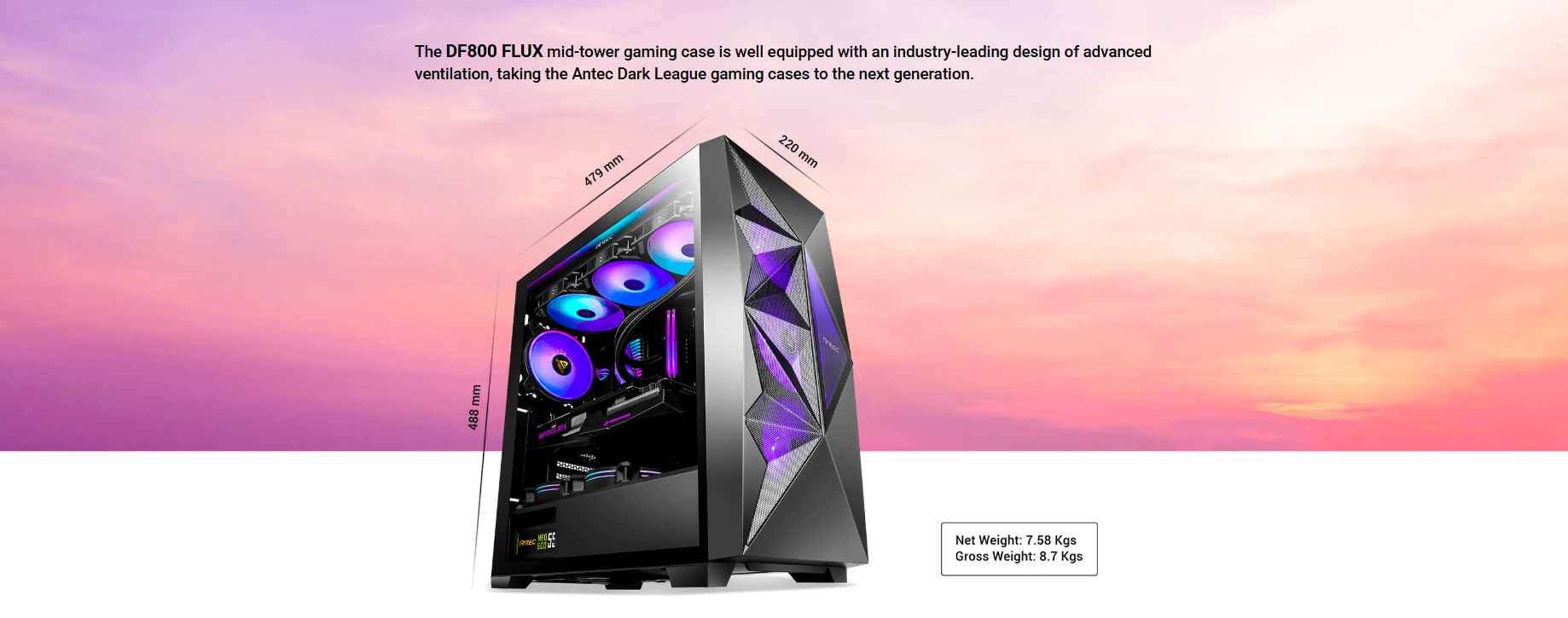 Dimensions : 479 x 220 x 488 mm (DWH) Form Factor : Mid Tower Materials : Steel+ Plastic Main board Support : ATX, Micro-ATX, Mini-lTX Front Access & Controls : Power, LED Control Button, Side Panel Expansion Slots Cooling Support 2 x USB3.0, MIC/HD-AUDIO : 4mm Tempered Glass Side Panel : 7; Drive bays :3.5″x 3; 2.5″x 3 : Front : 3 x 120mm / 3 x 140mm; Top: 3 x 120mm / 2 x 140mm; Rear: 1 x 120mm; PSU Shroud: 2 x 120mm Radiator Support : Front: 120/ 240/ 280/ 360mm; :5 55mm thickness (fans installed outside of the front panel) :5 30mm thickness (fans installed inside of the front panel) Top: 120/ 240/ 280/ 360mm; Rear: 120mm Max GPU Length : s 405mm Max CPU Cooler Height: s 175mm PSU Support : s 205mm Dust Filter : Top/ Bottom/ Right Hand Side Gross Weight : 8.70 kg