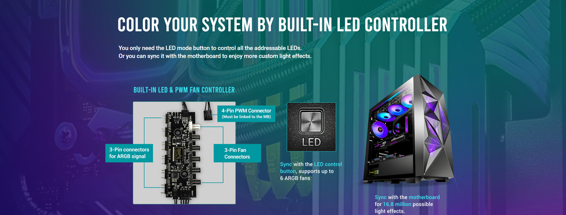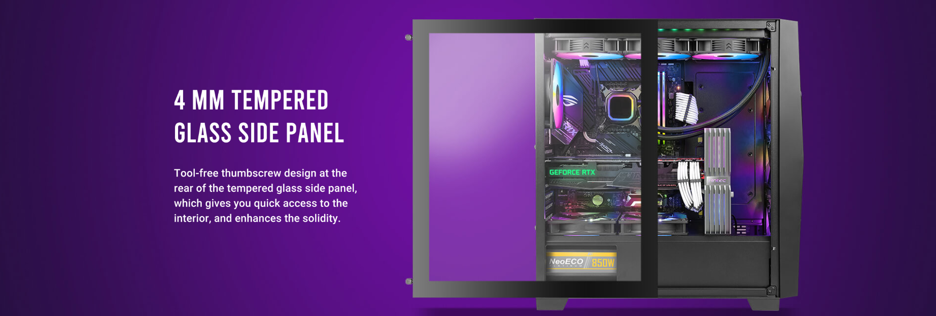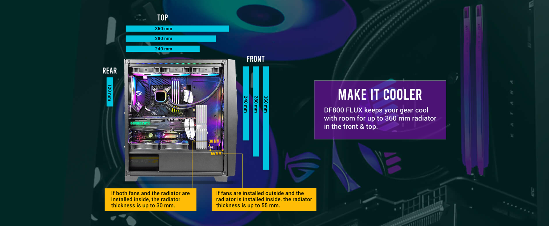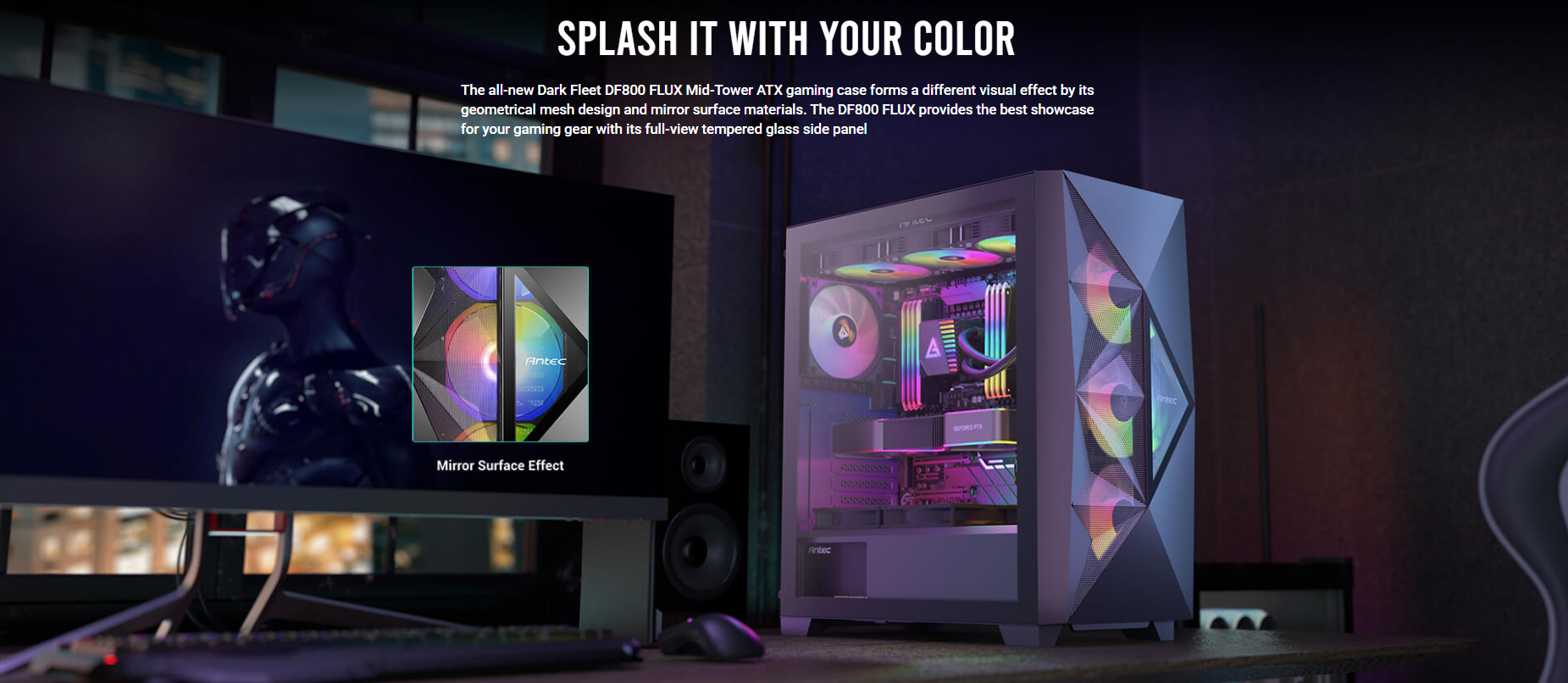 Dimensions : 479 x 220 x 488 mm (DWH) Form Factor : Mid Tower Materials : Steel+ Plastic Main board Support : ATX, Micro-ATX, Mini-lTX Front Access & Controls : Power, LED Control Button, Side Panel Expansion Slots Cooling Support 2 x USB3.0, MIC/HD-AUDIO : 4mm Tempered Glass Side Panel : 7; Drive bays :3.5″x 3; 2.5″x 3 : Front : 3 x 120mm / 3 x 140mm; Top: 3 x 120mm / 2 x 140mm; Rear: 1 x 120mm; PSU Shroud: 2 x 120mm Radiator Support : Front: 120/ 240/ 280/ 360mm; :5 55mm thickness (fans installed outside of the front panel) :5 30mm thickness (fans installed inside of the front panel) Top: 120/ 240/ 280/ 360mm; Rear: 120mm Max GPU Length : s 405mm Max CPU Cooler Height: s 175mm PSU Support : s 205mm Dust Filter : Top/ Bottom/ Right Hand Side Gross Weight : 8.70 kg