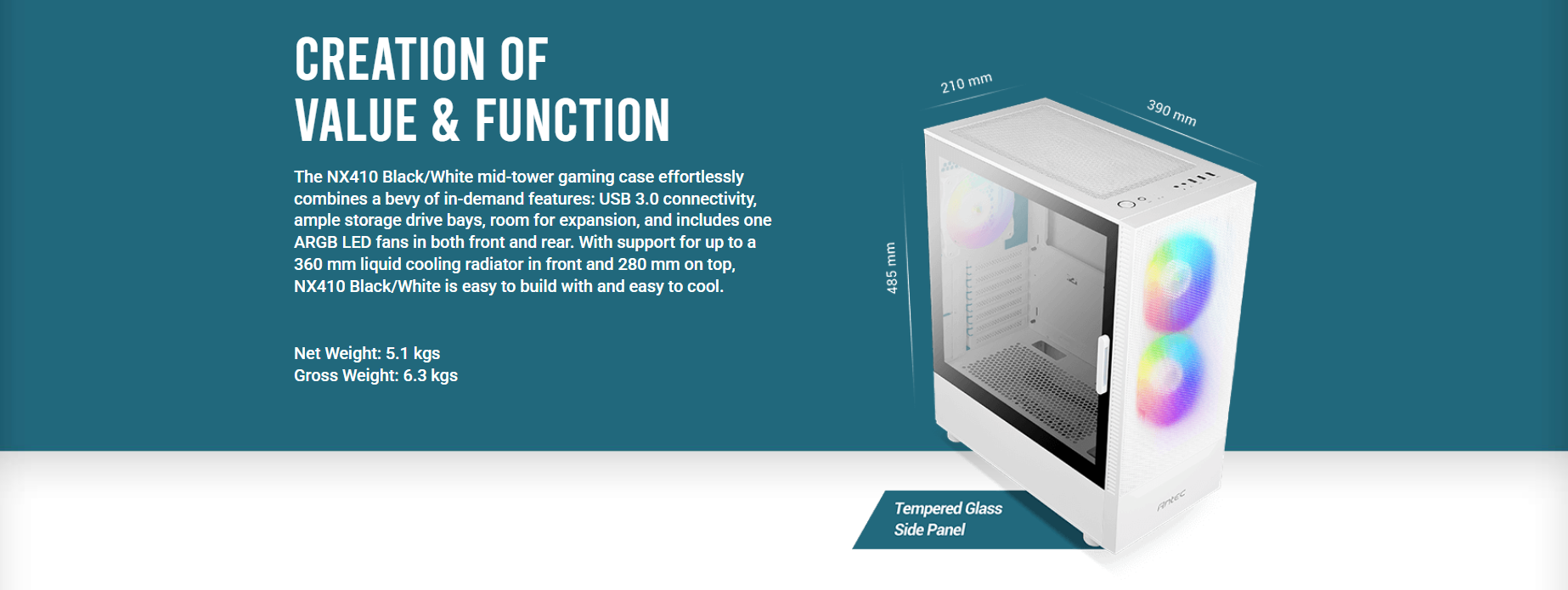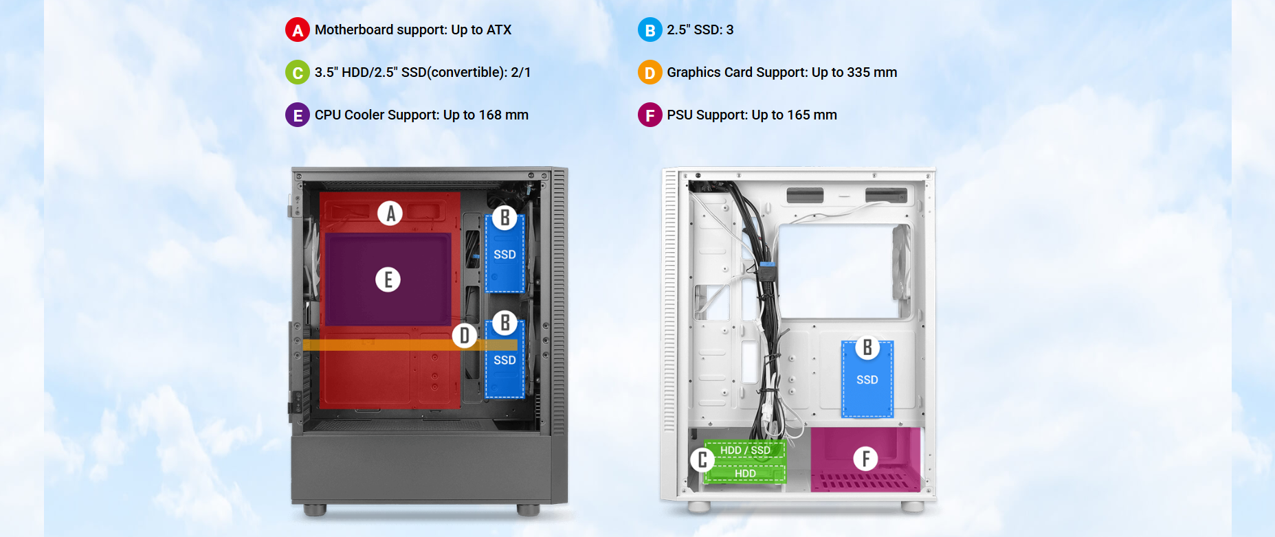Dimensions Form Factor : 336 x 302 x 390mm (DWH) :MidTower Materials : Steel, Glass Wood Ma inboard Support: Micro-ATX, ITX Front Access & Controls: Power, LED On/Off, USB3.0 x 2, Headphone/Mic Combo Jack Side Panel : Tempered Glass Expansion Slots : 4; Drive bays: 2.5″ X 1; 3.5″ I 2.S”x 2 I 1 Cooling Support :Top :2x 120mm/2x140mm; Rear :1 x120mm; PSU Shroud: 2 x 120mm Radiator Support : Front: Top Rear Max GPU Length : s 330mm Max CPU Cooler Height: s 164mm PSU Support : ,; 1 BSmm(lclude cable) Oust Filter : Top/ Bottom Gross Weight : 6.25 kg