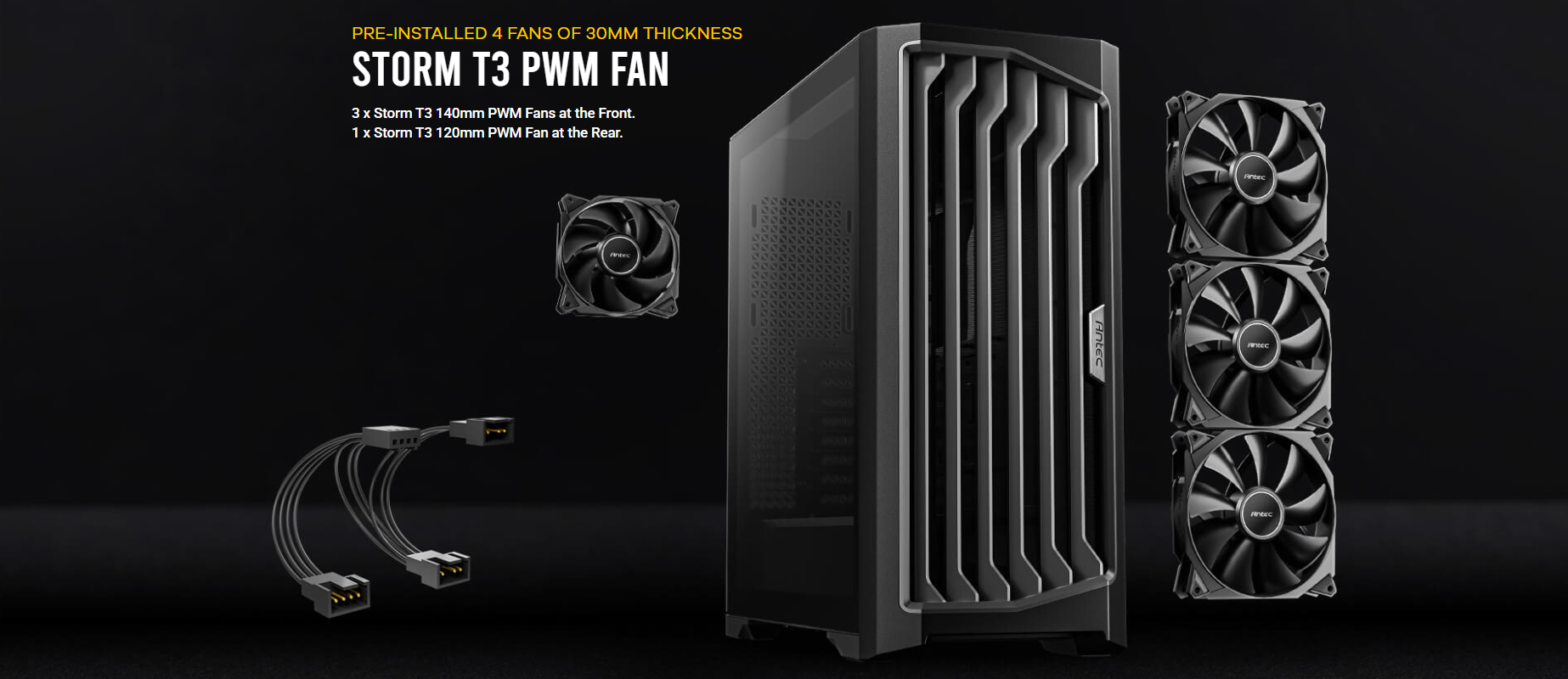 3 x 140 x 30mm PWM fans in front + 1 x 120 x 30mm PWM fan in rear