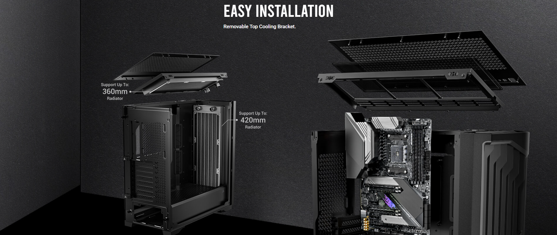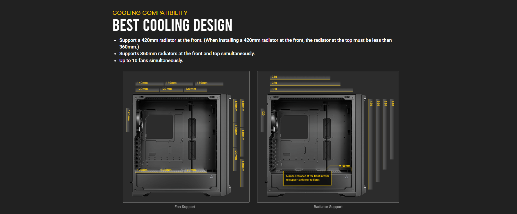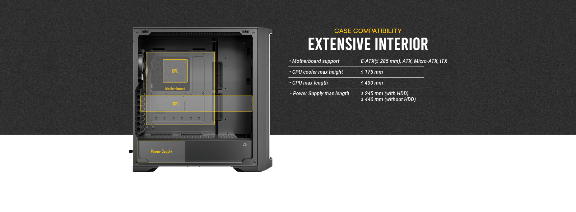 Dimensions Form Factor : 522 x 230 x S22mm (DWH) : Full Tower Materials : Steel+ Plastic+ Glass Ma inboard Support : E-ATX, ATX, M-ATX, ITX Front Access & Controls: Power, Reset, USB3.0 x 2, Type-C 1 0Gbps x 1, Headphone/Mic Combo Jack, Temp. Display Switch x 1 Side Panel Expansion Slots Cooling Support Radiator Support : 4mm Tempered Glass : 8; Drive bays: 3.5″ I 2.5 x 2 I 2; 2.5″x 3 : Front : 3 x 1 20mm/3 x 140mm; Top: 3 x 120mm/3 x 140mm; Power Supply Shroud: 3 x 1 20mm; Rear: 1 x 120mm : Front: 120 / 140 / 240 /280 / 360 / 420mm; Top: 120 / 140/ 240 / 280 / 360 mm Rear: 120mm Max GPU Length : :,; 400mm Max CPU Cooler Height : :,; 175mm Max PSU Support : (Include cable) s 245mm (with HDD) (Include cable) s 440mm (without HDD) Dust Filter Gross Weight : Front/Top/Bottom : 14.8Skg