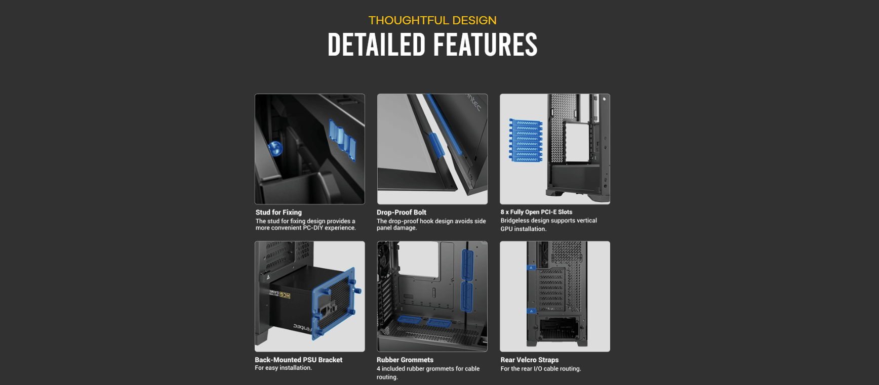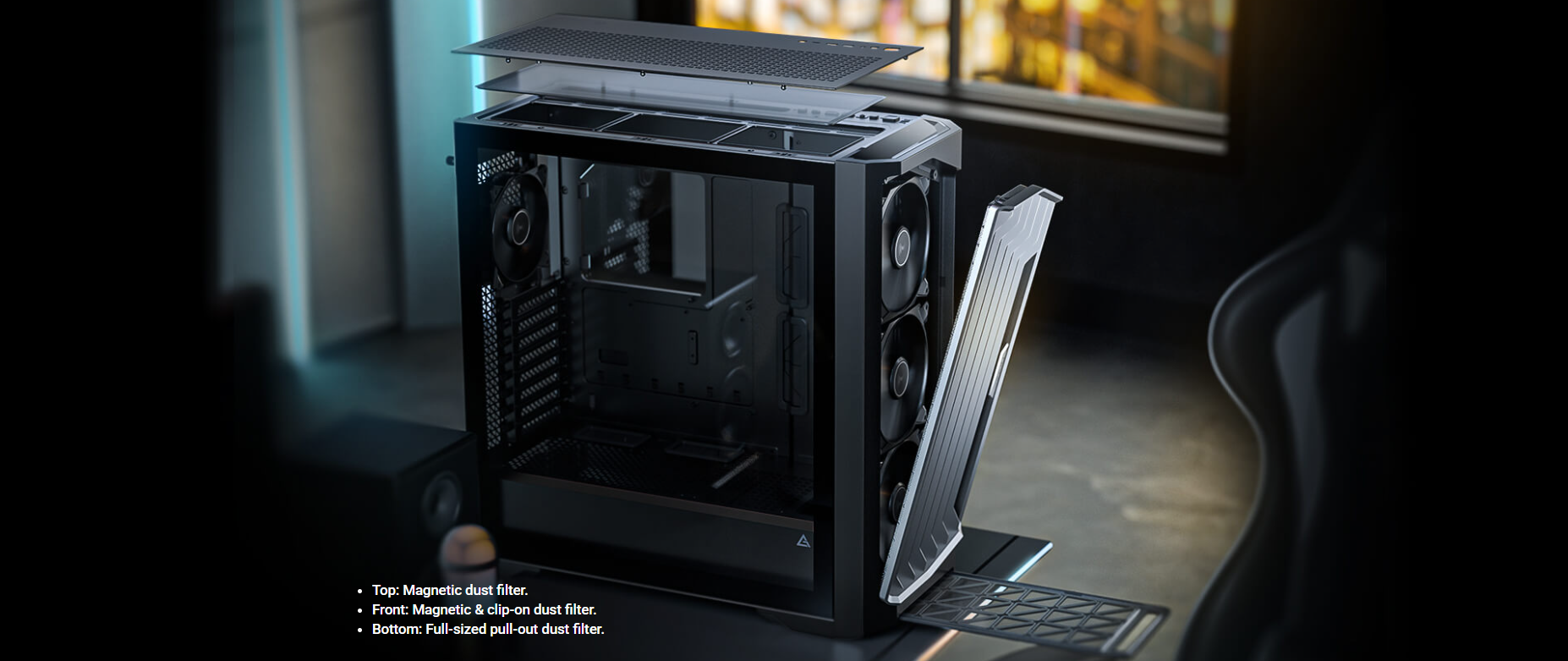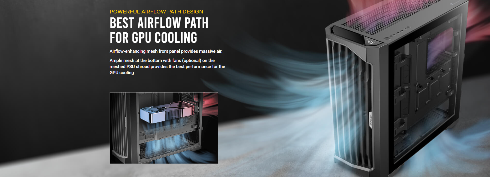 Dimensions Form Factor : 522 x 230 x S22mm (DWH) : Full Tower Materials : Steel+ Plastic+ Glass Ma inboard Support : E-ATX, ATX, M-ATX, ITX Front Access & Controls: Power, Reset, USB3.0 x 2, Type-C 1 0Gbps x 1, Headphone/Mic Combo Jack, Temp. Display Switch x 1 Side Panel Expansion Slots Cooling Support Radiator Support : 4mm Tempered Glass : 8; Drive bays: 3.5″ I 2.5 x 2 I 2; 2.5″x 3 : Front : 3 x 1 20mm/3 x 140mm; Top: 3 x 120mm/3 x 140mm; Power Supply Shroud: 3 x 1 20mm; Rear: 1 x 120mm : Front: 120 / 140 / 240 /280 / 360 / 420mm; Top: 120 / 140/ 240 / 280 / 360 mm Rear: 120mm Max GPU Length : :,; 400mm Max CPU Cooler Height : :,; 175mm Max PSU Support : (Include cable) s 245mm (with HDD) (Include cable) s 440mm (without HDD) Dust Filter Gross Weight : Front/Top/Bottom : 14.8Skg