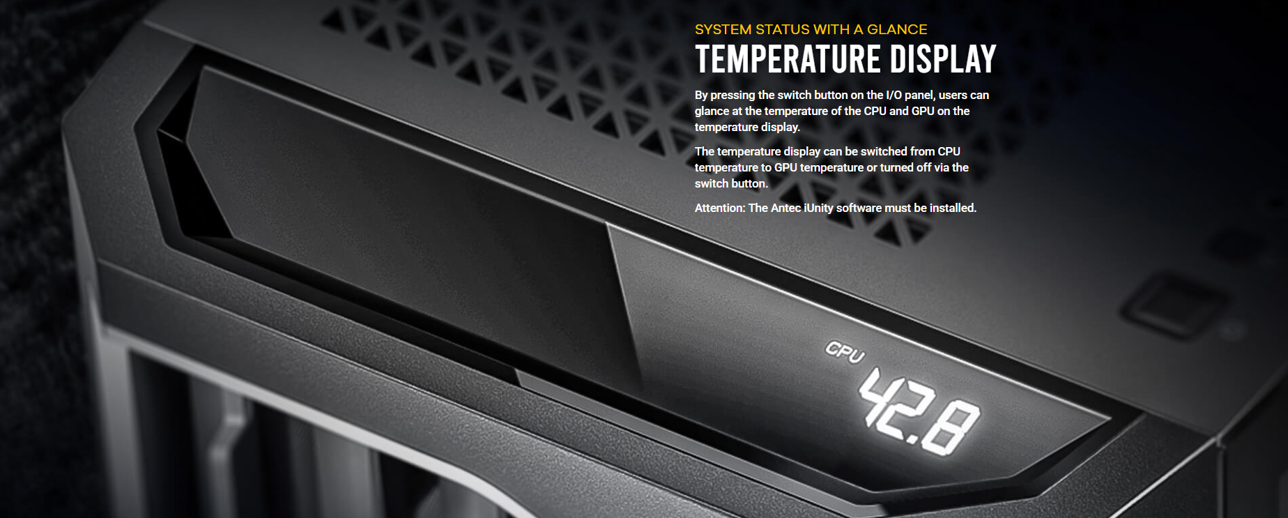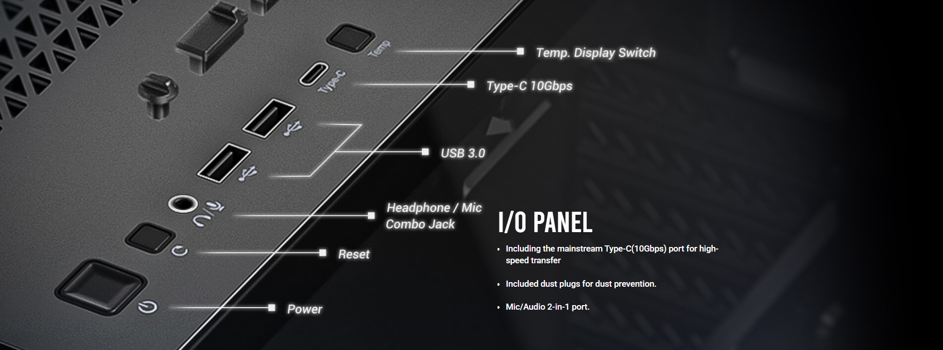 Power, Reset , USB 3.0 x 2, Type-C 10Gbps x 1, Headphone/Mic Combo Jack, Temp. Display Switch x 1 |