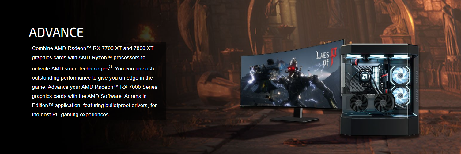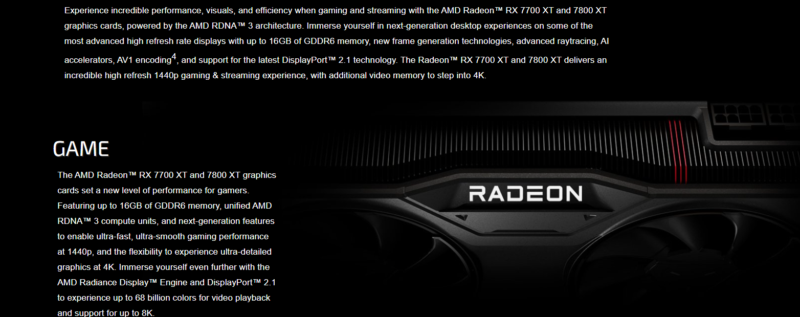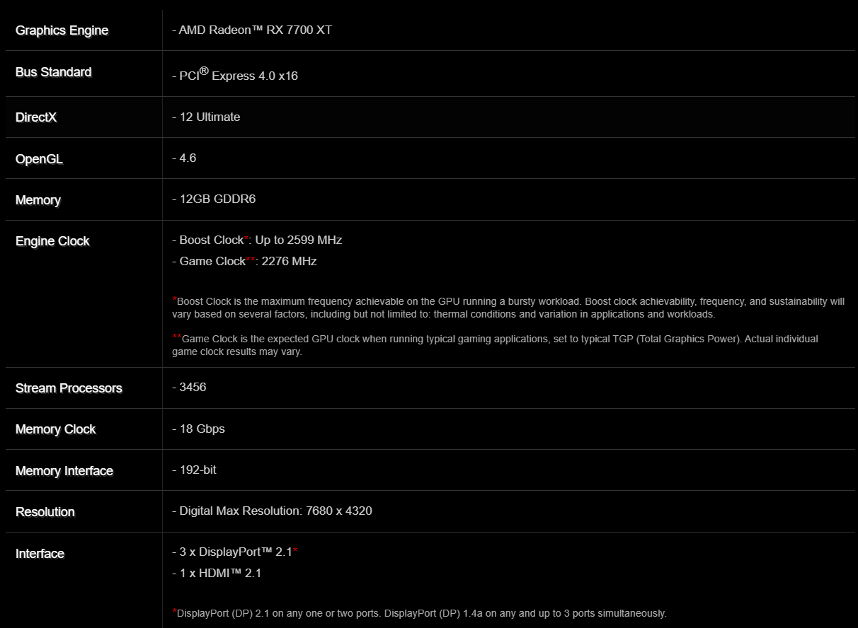 • Key Specification AMD Radeon RX 7700 XT GPU 12GB GDDR6 on 192-Bit Memory Bus 54 AMD RDNA 3 Compute Units (with RT+AI Accelerators) 48MB AMD Infinity Cache technology Microsoft DirectX 12 Ultimate PCI Express 4.0 Support 2 x 8-pin Power Connectors 3 x DisplayPort 2.1***, 1 x HDMI 2.1