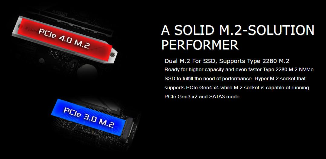 – 6 x SATA3 6.0 Gb/s Connectors, support RAID (RAID 0, RAID 1 and RAID 10), NCQ, AHCI and Hot Plug* – 1 x Hyper M.2 Socket (M2_1), supports M Key type 2280 M.2 PCI Express module up to Gen4x4 (64 Gb/s) (with Vermeer, Matisse) or Gen3x4 (32 Gb/s) (with Cezanne, Renoir and Picasso)** – 1 x M.2 Socket (M2_2), supports M Key type 2280 M.2 SATA3 6.0 Gb/s module and M.2 PCI Express module up to Gen3 x2 (16 Gb/s)**