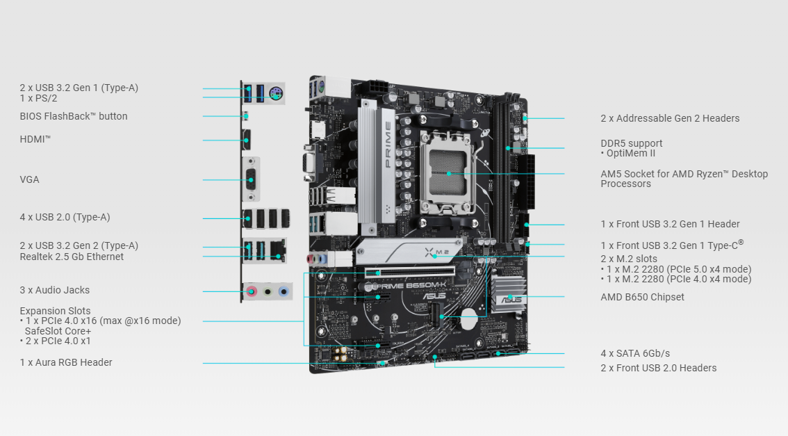 2 x USB 3.2 Gen 2 ports (2 x Type-A) 2 x USB 3.2 Gen 1 ports (2 x Type-A) 4 x USB 2.0 ports (4 x Type-A) 1 x VGA port 1 x HDMI™ port 1 x Realtek 2.5Gb Ethernet port 3 x Audio jacks 1 x BIOS FlashBack™ button 1 x PS/2 Keyboard/Mouse combo port