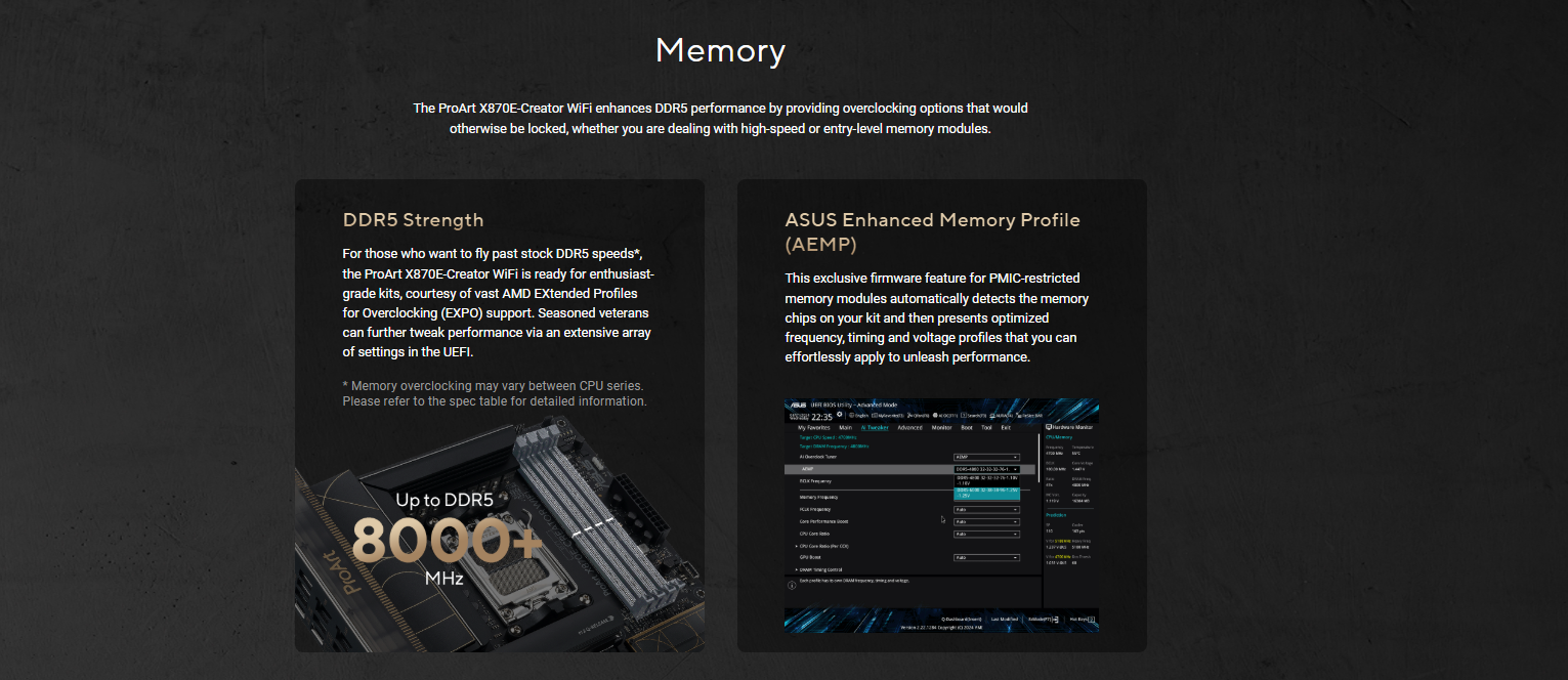4 x DIMM slots, max. 256GB, DDR5 Support up to 8000+MT/s(OC) with Ryzen™ 9000 Series Processors, 8000+MT/s(OC) with Ryzen™ 8000 Series Processors, 8000+MT/s(OC) with Ryzen™ 7000 Series Processors, ECC and Non-ECC Un-buffered DIMM Dual Channel Memory Architecture Supports AMD Extended Profiles for Overclocking (EXPO™) ASUS Enhanced Memory Profile (AEMP) * Adjustments will be made based on the specifications of mass-produced memory products available on the market. ** Supported memory types, data rate(Speed), and number of DRAM module vary depending on the CPU and memory configuration, for more information refer to www.asus.com for memory support list. *** Non-ECC, Un-buffered DDR5 Memory supports On-Die ECC function.