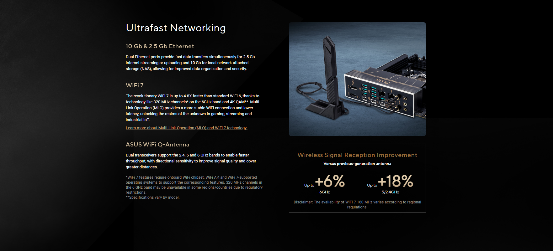 Wi-Fi 7 (Qualcomm QCNCM865 or MediaTek MT7927)* 2×2 Wi-Fi 7** (802.11be) Supports 2.4/5/6GHz frequency band*** Supports Wi-Fi 7 320MHz bandwidth Bluetooth® v5.4**** *The actual Wi-Fi module that comes with this motherboard may vary, please refer to the label on the product for more details. **Wi-Fi features may vary depending on the operating system For Windows 11, Wi-Fi 7 will require 24H2 or later version for full functions, Windows 11 21H2/22H2/23H2 only support Wi-Fi 6E. For Windows 10, please note that no driver is available, refer to the Wi-Fi chipset vendor’s website for details. *** Wi-Fi 6GHz frequency band and bandwidth regulatory may vary between countries. **** The Bluetooth® version may vary, please refer to the Wi-Fi module manufacturer’s website for the latest specifications.