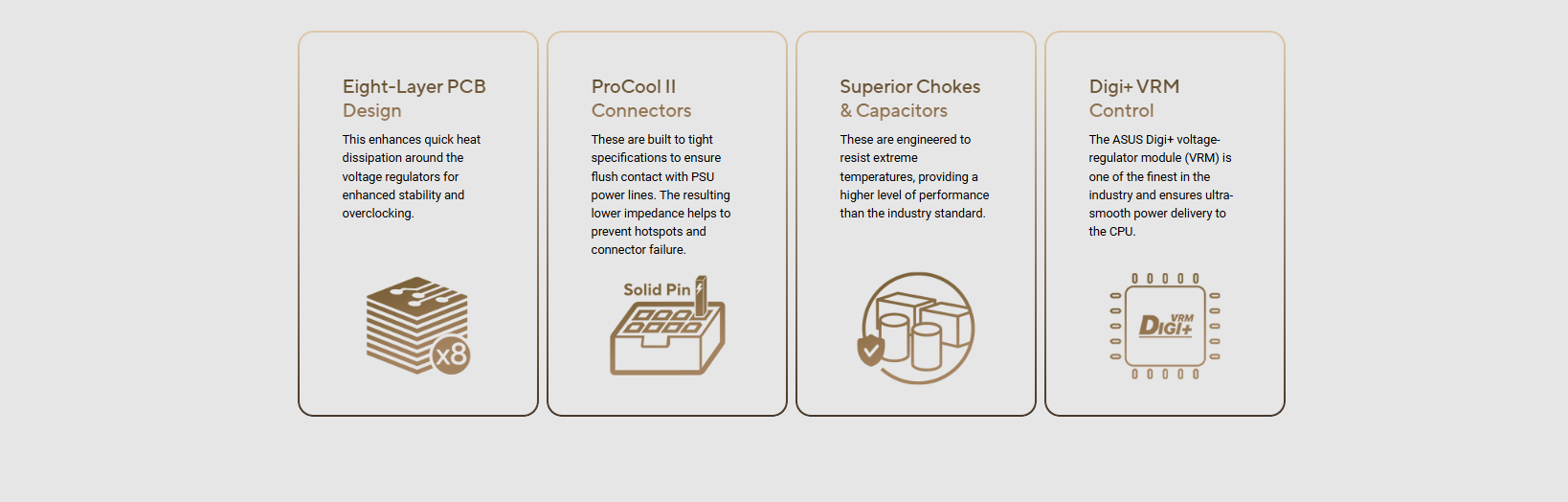 ASUS 5X PROTECTION III – DIGI+ VRM (- Digital power design) – Enhanced DRAM Overcurrent Protection – ESD Guards – LANGuard – Overvoltage Protection – Safeslot – Stainless-Steel Back I/O ASUS Q-Design – M.2 Q-Latch – M.2 Q-Release – M.2 Q-Slide – PCIe Slot Q-Release Slim (with PCIe SafeSlot) – Q-Antenna – Q-Connector – Q-DIMM – Q-LED (CPU [red], DRAM [yellow], VGA [white], Boot Device [yellow green]) – Q-Slot ASUS Thermal Solution – M.2 heatsink backplate – M.2 heatsinks – VRM heatsink design  ASUS EZ DIY – BIOS FlashBack™ button – BIOS FlashBack™ LED – ProCool – Pre-mounted I/O shield – SafeSlot – SafeDIMM AURA Sync – Addressable Gen 2 headers Bespoke Motherboard Design & Business Focused Features – 24/7 Reliability – Overcurrent Protection Front Panel USB 20Gbps with Quick Charge 4+ Support – Support: up to 30W fast charging and USB Wattage Watcher – Output: 5V/9V max. 3.0A, 12V max 2.5A, 15V max2.0A – Compatible with PD3.0