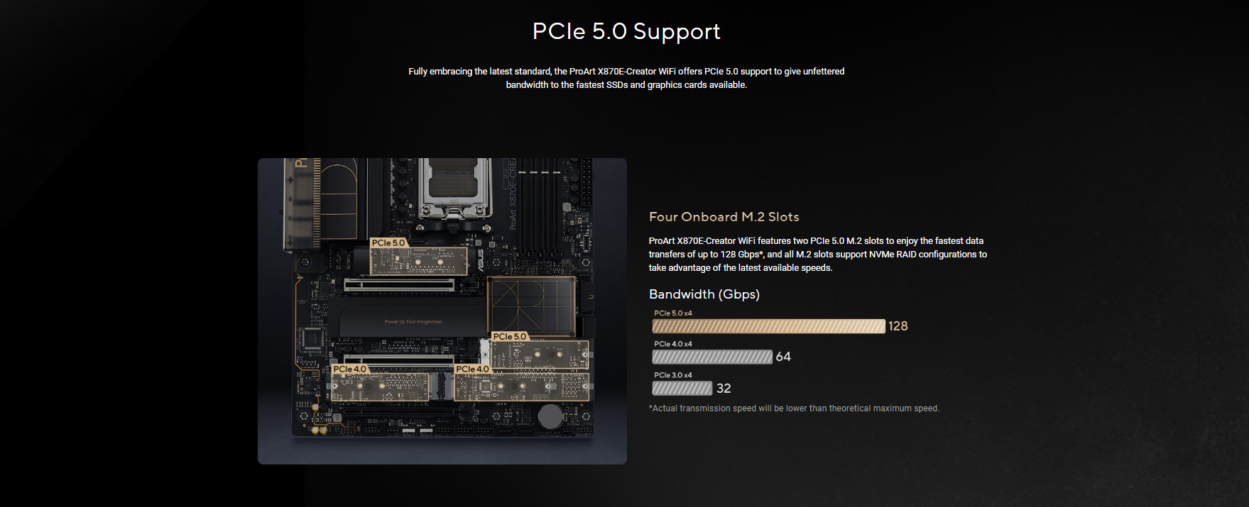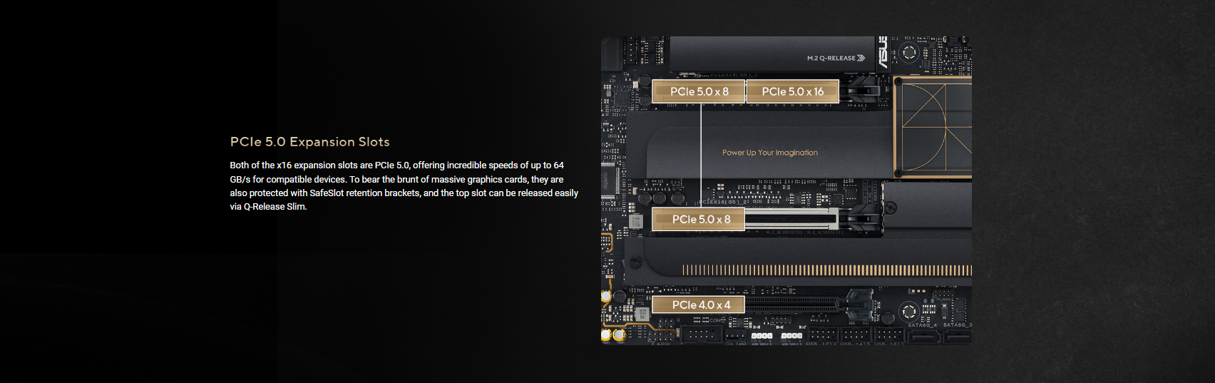 AMD Ryzen™ 9000 & 7000 Series Desktop Processors* 2 x PCIe 5.0 x16 slots with Q-Release Slim (supports x16 or x8/x8** or x8/x4/x4 modes***) AMD Ryzen™ 8700 & 8600 & 8400 Series Desktop Processors* 1 x PCIe 4.0 x16 slots with Q-Release Slim (only supports PCIEX16(G5)_1 & total bandwidth of x8, PCIEX16(G5)_2 will be disabled) AMD Ryzen™ 8500 & 8300 Series Desktop Processors* 1 x PCIe 4.0 x16 slots with Q-Release Slim (only supports PCIEX16(G5)_1 & total bandwidth of x4,  PCIEX16(G5)_2 will be disabled) AMD X870E Chipset 1 x PCIe 4.0 x16 slot (supports x4 mode) * Please check the PCIe bifurcation table on the support site (https://www.asus.com/support/FAQ/1037507/). ** When you use both PCIEX16(G5)_1 and PCIEX16(G5)_2, they will run at x8 each. *** PCIEX16(G5)_2 shares bandwidth with M.2_2 slot. When M.2_2 is enabled, PCIEX16(G5)_1 will run x8, and PCIEX16(G5)_2 will run at x4. – To ensure compatibility of the device installed, please refer to https://www.asus.com/support/ for the list of supported peripherals.