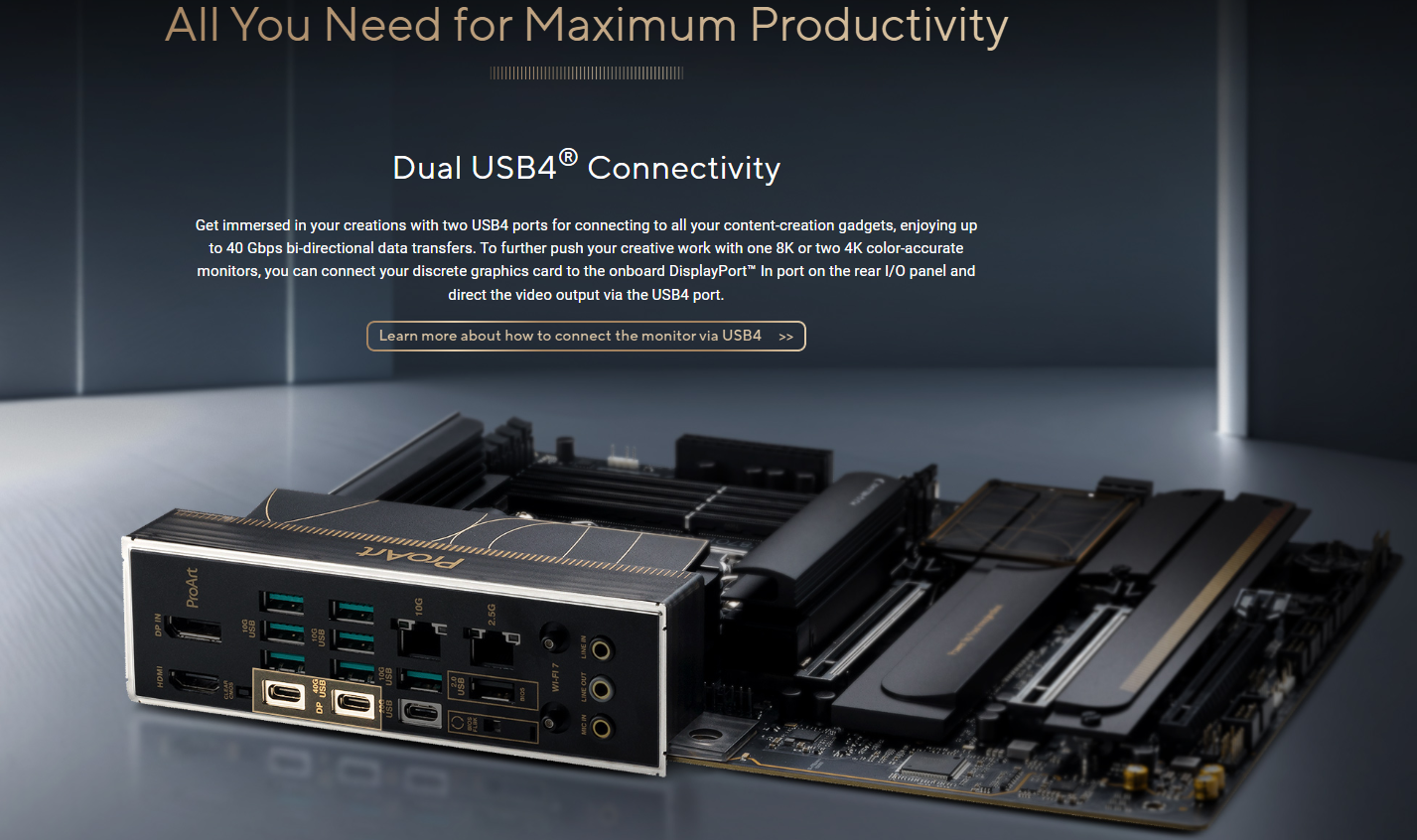 1 x HDMI™ port** 2 x USB4® (40Gbps) ports support USB Type-C® display outputs*** * Graphics specifications may vary between CPU types. Please refer to AMD CPU specifications. ** Supports 4K@60Hz as specified in HDMI 2.1.   *** Supports max. 8K@60Hz as specified in DisplayPort 1.4. **** VGA resolution support depends on processors’ or graphic cards’ resolution.