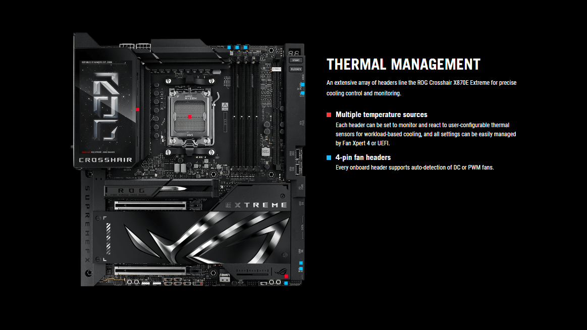 Fan and Cooling related 1 x 4-pin CPU Fan header 1 x 4-pin CPU OPT Fan header 2 x 4-pin Chassis Fan headers 2 x 4-pin Radiator Fan headers 2 x W_PUMP+ headers 1 x VRM Heatsink Fan header Power related 1 x 24-pin Main Power connector 2 x 8-pin +12V CPU Power connector 1 x 8-pin PCIe Power connector Storage related 3 x M.2 slots (Key M) 1 x DIMM.2 slot supports 2 x M.2 slots (Key M) 1 x SlimSAS connector 4 x SATA 6Gb/s ports USB 1 x USB 20Gbps connector (supports USB Type-C®) 1 x USB 10Gbps connector (supports USB Type-C®) 2 x USB 5Gbps headers support 4 additional USB 5Gbps ports 2 x USB 2.0 headers support 4 additional USB 2.0 ports Miscellaneous 1 x 6-pin ARGB Gen 2 header to support 2 x ARGB Gen 2 headers 2 x Addressable Gen 2 header 1 x Alteration PCIe mode switch 2 x BCLK button 1 x BIOS Switch 1 x FlexKey button 1 x Front Panel Audio header (F_AUDIO) 1 x LN2 Mode jumper 12 x ProbeIt Measurement Points 1 x ReTry button 2 x RSVD switchs 1 x RSVD header 1 x Safe Boot button 1 x Slow Mode switch 1 x Start button 1 x 10-1 pin System Panel header 1 x Thermal Sensor header 1 x Pause switch