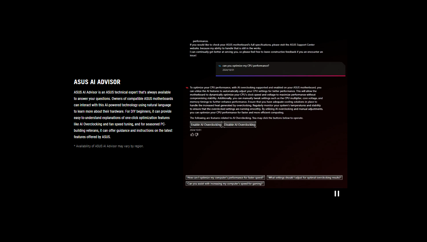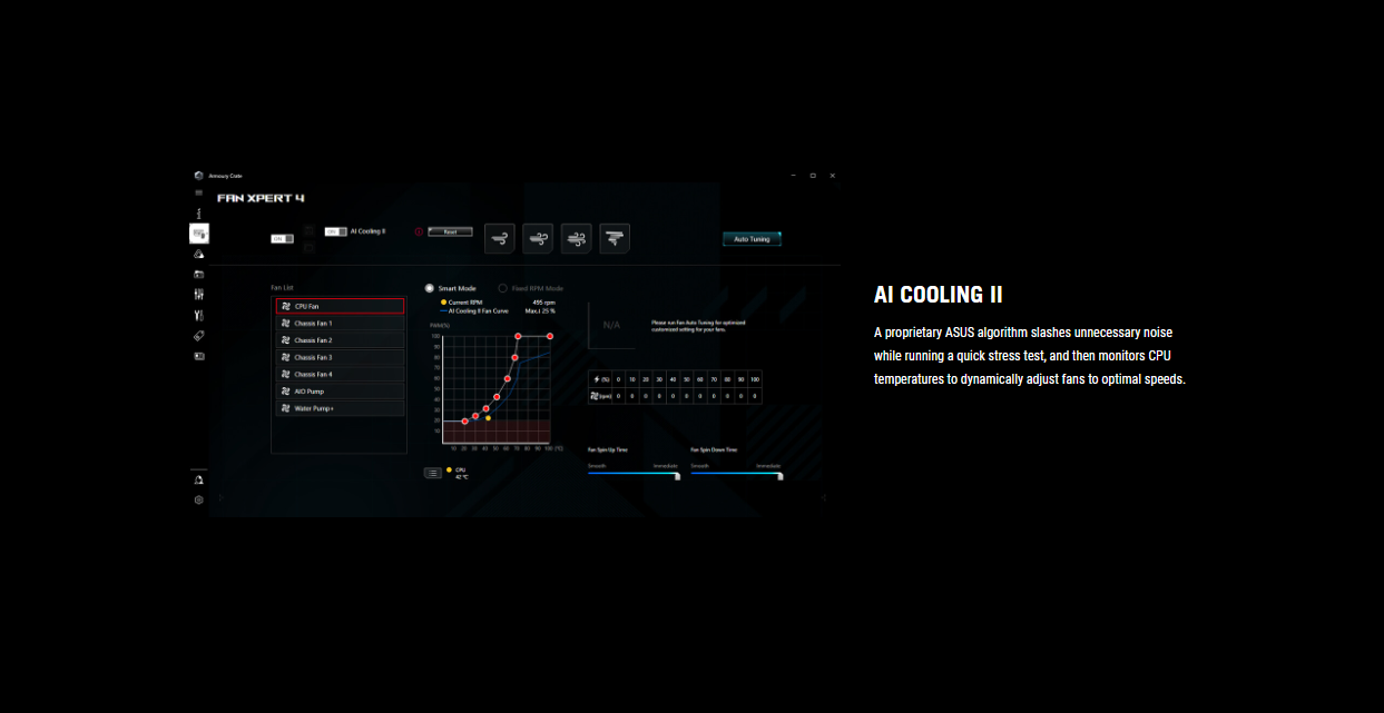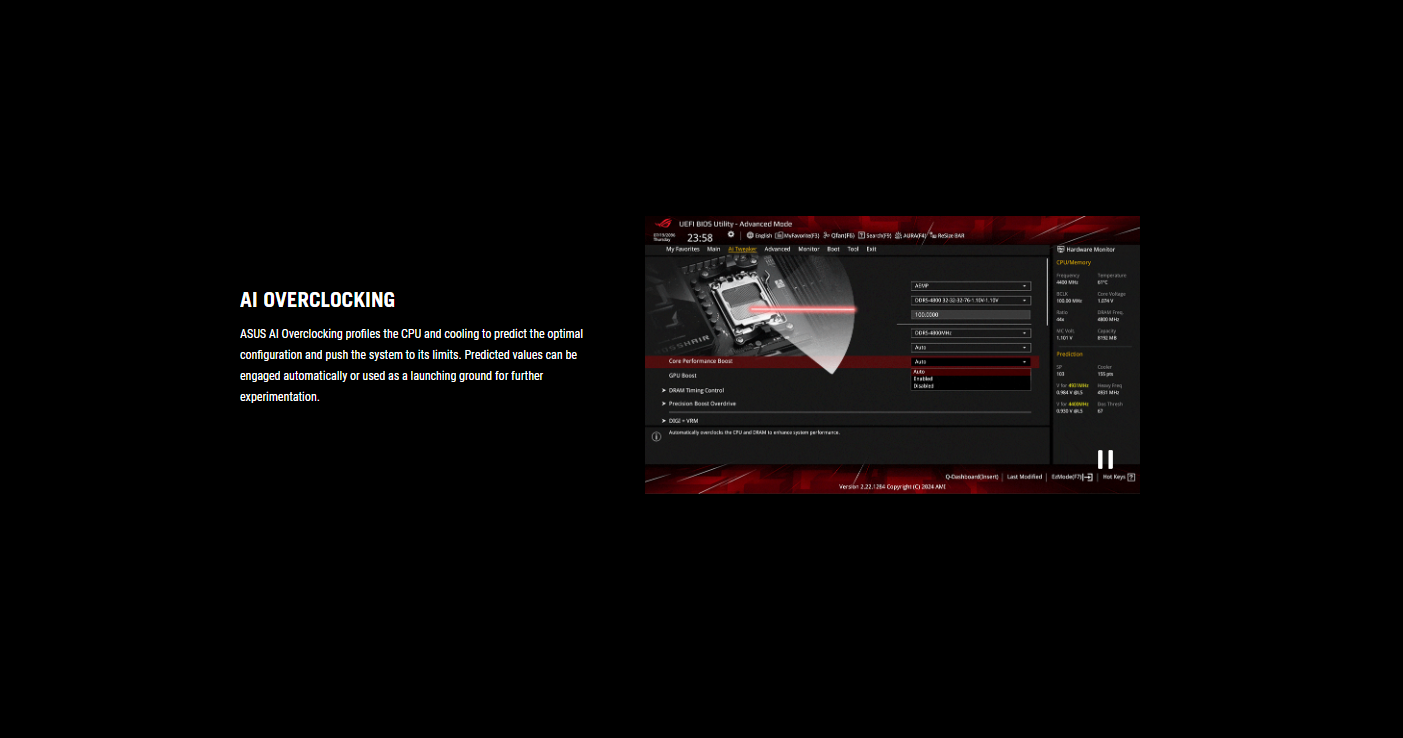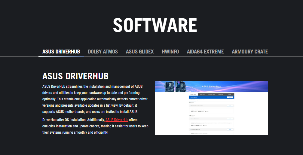 ROG Exclusive Software – ROG CPU-Z – Dolby Atmos – Internet Security (1-year full version) ASUS Exclusive Software Armoury Crate – AIDA64 Extreme (1 year full version) – Aura Creator – Aura Sync – Fan Xpert 4 (with AI Cooling II) – GameFirst – HWiNFO – Power Saving – LCD Display ASUS AI Advisor ASUS DriverHub Turbo Vcore ASUS GlideX USB Wattage Watcher WinRAR (40 Days Free Trial) Adobe Creative Cloud (Free Trial) UEFI BIOS AI Overclocking Guide ASUS EZ DIY – ASUS CrashFree BIOS 3 – ASUS EZ Flash 3 – ASUS UEFI BIOS EZ Mode – ASUS MyHotkey FlexKey