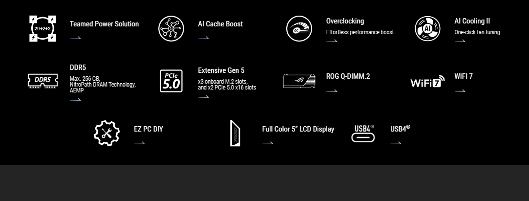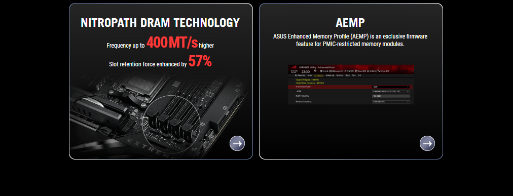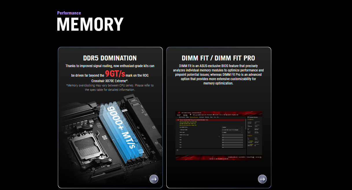 4 x DIMM slots, max. 256GB, DDR5 Supports up to 8200+MT/s(OC) with Ryzen™ 9000 Series Processors, 9000+MT/s(OC) with Ryzen™ 8000 Series Processors, 8000+MT/s(OC) with Ryzen™ 7000 Series Processors, ECC and Non-ECC, Un-buffered DIMM* Dual Channel Memory Architecture Supports AMD Extended Profiles for Overclocking (EXPO™) ASUS Enhanced Memory Profile (AEMP) NitroPath DRAM Technology *Supported memory types, data rate (speed), and number of DRAM modules vary depending on the CPU and memory configuration, for more information please refer to CPU/Memory Support list under theSupport tab of product information site or visit https://www.asus.com/support/download-center/. * Non-ECC, un-buffered DDR5 memory supports On-Die ECC function.