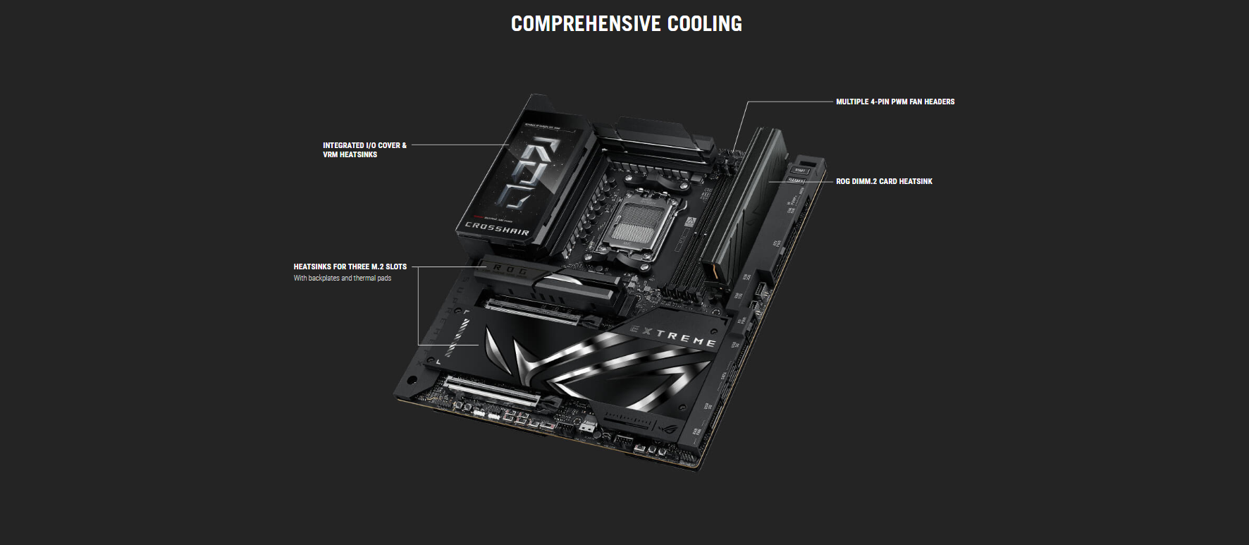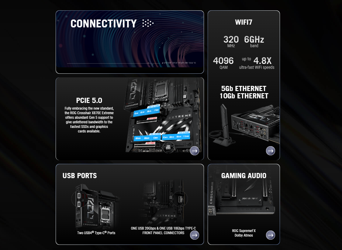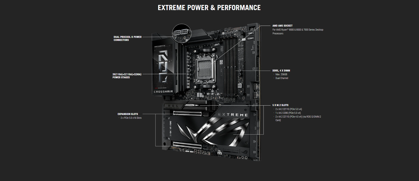 Supports up to 5 x M.2 slots and 1 x SlimSAS connector and 4 x SATA 6Gb/s ports AMD Ryzen™ 9000 & 7000 Series Desktop Processors M.2_1 slot (Key M), type 2242/2260/2280/22110 (supports PCIe 5.0 x4 mode) M.2_2 slot (Key M), type 2242/2260/2280 (supports PCIe 5.0 x4 mode) M.2_3 slot (Key M), type 2242/2260/2280/22110 (supports PCIe 5.0 x4 mode) AMD Ryzen™ 8000 Series Desktop Processors M.2_1 slot (Key M), type 2242/2260/2280/22110 (supports PCIe 4.0 x4 mode) M.2_2 slot (Key M), type 2242/2260/2280 (Not supports) M.2_3 slot (Key M), type 2242/2260/2280/22110 (Not supports) AMD X870E Chipset DIMM.2_1 slot (Key M) via ROG Q-DIMM.2, type 2230/2242/2260/2280/22110 (supports PCIe 4.0 x4 mode) DIMM.2_2 slot (Key M) via ROG Q-DIMM.2, type 2230/2242/2260/2280/22110 (supports PCIe 4.0 x4 mode) SlimSAS connector supports PCIe 4.0 x4 mode via an SFF-8654 adapter cable. The cable is purchased separately. 4 x SATA 6Gb/s ports * When M.2_2 is enabled, but M.2_3 is not in use, PCIEX16_1 will run in x8 mode and PCIEX16_2 will be disabled. ** When M.2_3 is enabled, but M.2_2 is not in use, PCIEX16_1 will run in x8 mode and PCIEX16_2 will run in x4 mode. *** When both M.2_2 and M.2_3 are enabled, PCIEX16_1 will run in x8 mode and PCIEX16_2 will be disabled.