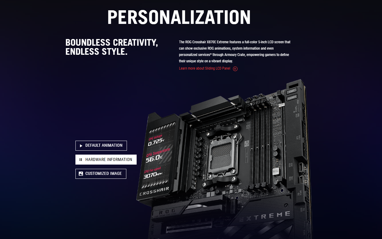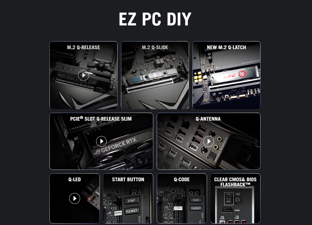 Extreme OC Kit – FlexKey button – LN2 Mode – ProbeIt – ReTry button – Safe boot button – Start button – Slow Mode Extreme Engine Digi+ – 10K Black Metallic Capacitors – MicroFine Alloy Choke ASUS Q-Design – M.2 Q-Latch – M.2 Q-Release – M.2 Q-Slide – Q-Release Slim (with PCIe SafeSlot) – Q-Antenna – Q-Code – Q-Connector – Q-Dashboard – Q-LED (CPU [red], DRAM [yellow], VGA [white], Boot Device [yellow green]) – Q-Slot – Q-DIMM.2 ASUS Thermal Solution – Fan bracket – M.2 heatsink backplate – M.2 heatsink – Metal backplate – VRM heatsink design – 3D VC M.2 Heatsink ASUS EZ DIY – Backplate – BIOS FlashBack™ button – Clear CMOS button – CPU Socket lever protector – ProCool II – Pre-mounted I/O shield – SafeSlot – SafeDIMM Aura Sync – Addressable Gen 2 headers Dual BIOS Full Color 5″ LCD Display Front Panel USB 20Gbps with Quick Charge 4+ Support – Support: up to 60W fast charging and USB Wattage Watcher* – Output: 5/9/15/20V max. 3A, PPS:3.3–21V max. 3A – Compatible with PD3.0 and PPS * To support 60W, please install the power cable to the 8-pin PCIe power connector or else only 27W will be supported.