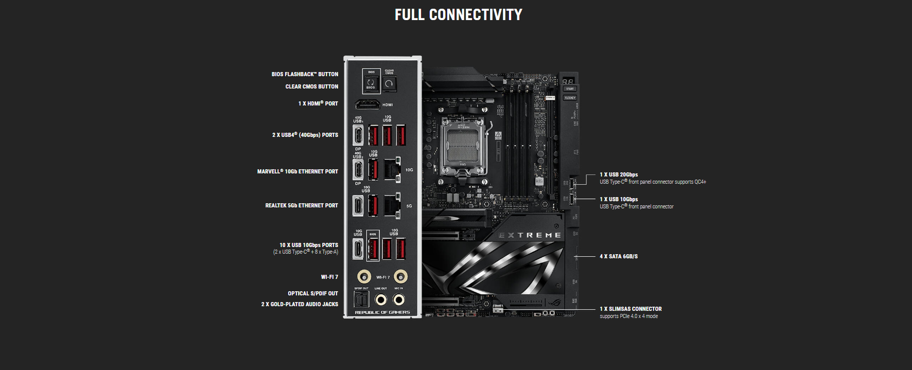 2 x USB4® (40Gbps) ports (2 x USB Type-C®) 10 x USB 10Gbps ports (8 x Type-A + 2 x USB Type-C®) 1 x HDMITM port 1 x Wi-Fi Module 1 x Realtek 5Gb Ethernet port 1 x Marvell® AQtion 10Gb Ethernet port 2 x LED-illuminated audio jacks 1 x Optical S/PDIF out port 1 x BIOS FlashBack™ button 1 x Clear CMOS button