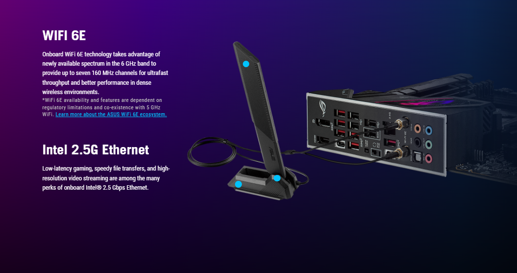 Wi-Fi 6E 2×2 Wi-Fi 6E (802.11 a/b/g/n/ac/ax)  Supports 2.4/5/6GHz frequency band Bluetooth v5.2 * WiFi 6E 6GHz regulatory may vary between countries.