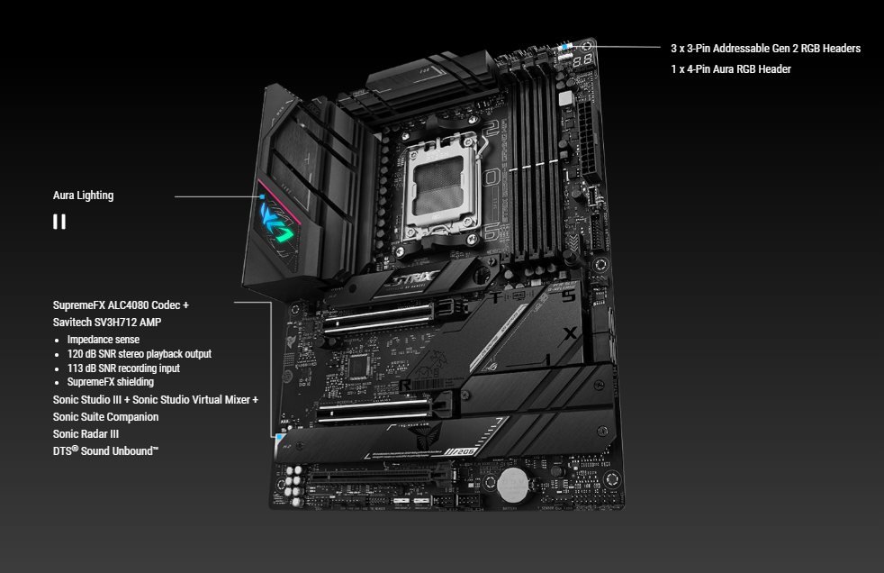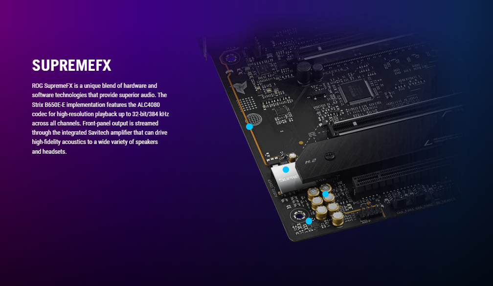 ROG SupremeFX 7.1 Surround Sound High Definition Audio CODEC ALC4080 – Impedance sense for front and rear headphone outputs – Supports: Jack-detection, Multi-streaming, Front Panel Jack-retasking – High quality 120 dB SNR stereo playback output and 113 dB SNR recording input – Supports up to 32-Bit/384 kHz playback” Audio Features  – Audio Shielding – Savitech SV3H712 AMP – Rear optical S/PDIF out port  – Premium audio capacitors – Audio cover