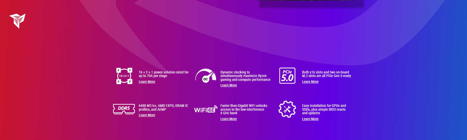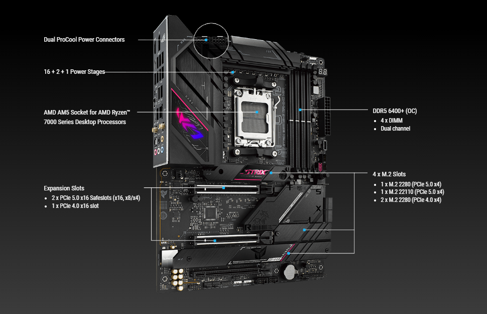 AMD Ryzen™ Desktop Processors* 2 x PCIe 5.0 x16 slots (supports x16 & x8/x4 modes) AMD B650 Chipset** 1 x PCIe 4.0 x16 slot (supports x4 mode) * Please check PCIe bifurcation table in support site (https://www.asus.com/support/FAQ/1037507/).