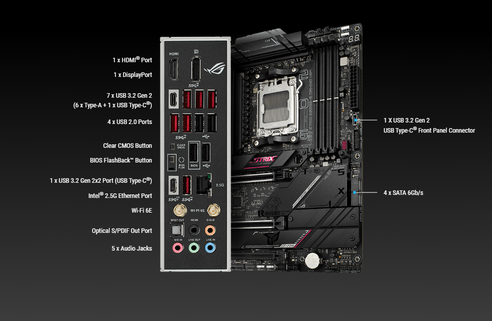 1 x USB 3.2 Gen 2×2 port (1 x Type-C®) 7 x USB 3.2 Gen 2 ports (6 x Type-A, 1 xUSB Type-C®)  4 x USB 2.0 ports 1 x DisplayPort 1 x HDMI® port 1 x Wi-Fi Module 1 x Intel® 2.5Gb Ethernet port 5 x Audio jacks* 1 x Optical S/PDIF out port 1 x BIOS FlashBack™  button  1 x Clear CMOS button *The rear panel Line out port does not support spatial audio. If you wish to use spatial audio make sure to connect your audio output device to the audio jack on the front panel of your chassis.