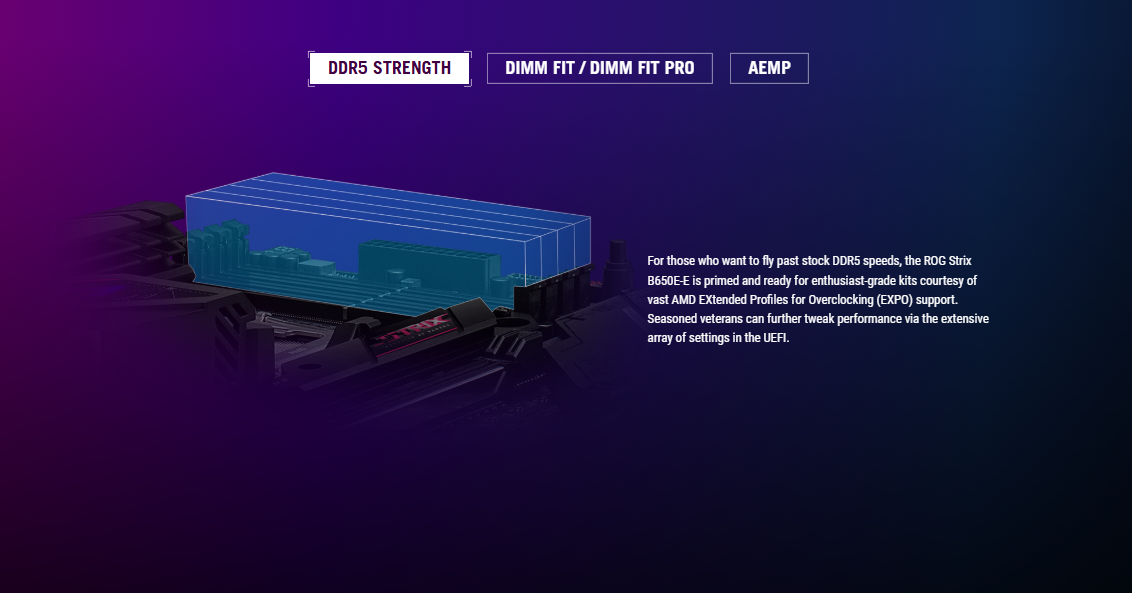 4 x DIMM, Max. 192GB, DDR5 8000+(OC)/7800(OC)/7600(OC)/7200(OC)/7000(OC)/6800(OC)/6600(OC)/6400(OC)/ 6200(OC)/ 6000(OC)/ 5800(OC)/ 5600(OC)/ 5400(OC)/ 5200/ 5000/ 4800 ECC andNon-ECC, Un-buffered Memory* Dual Channel Memory Architecture  Supports AMD EXTended Profiles for Overclocking (EXPO™) OptiMem II  * Supported memory types, data rate(Speed), and number of DRAM module vary depending on the CPU and memory configuration, for more information refer to www.asus.com for memory support list.  * Non-ECC, Un-buffered DDR5 Memory supports On-Die ECC function