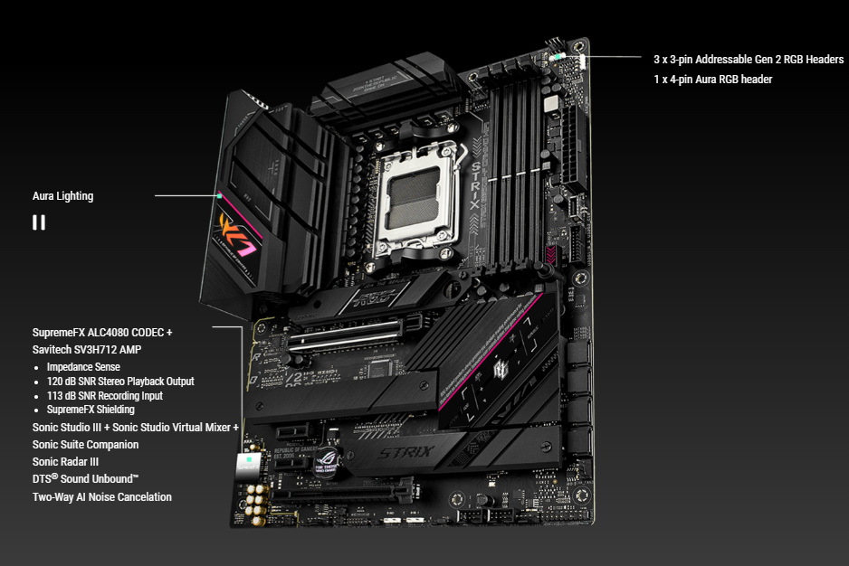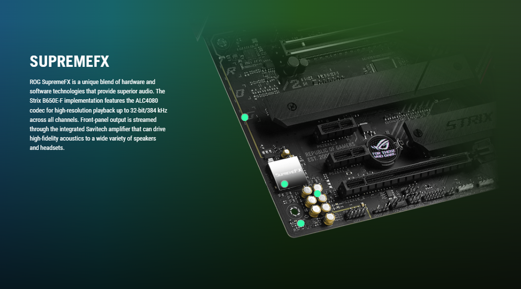 ROG SupremeFX 7.1 Surround Sound High Definition Audio CODEC ALC4080 – Impedance sense for front and rear headphone outputs – Supports: Jack-detection, Multi-streaming, Front Panel Jack-retasking – High quality 120 dB SNR stereo playback output and 113 dB SNR recording input – Supports up to 32-Bit/384 kHz playback Audio Features – SupremeFX Shielding Technology – Savitech SV3H712 AMP – Premium audio capacitors – Audio cover