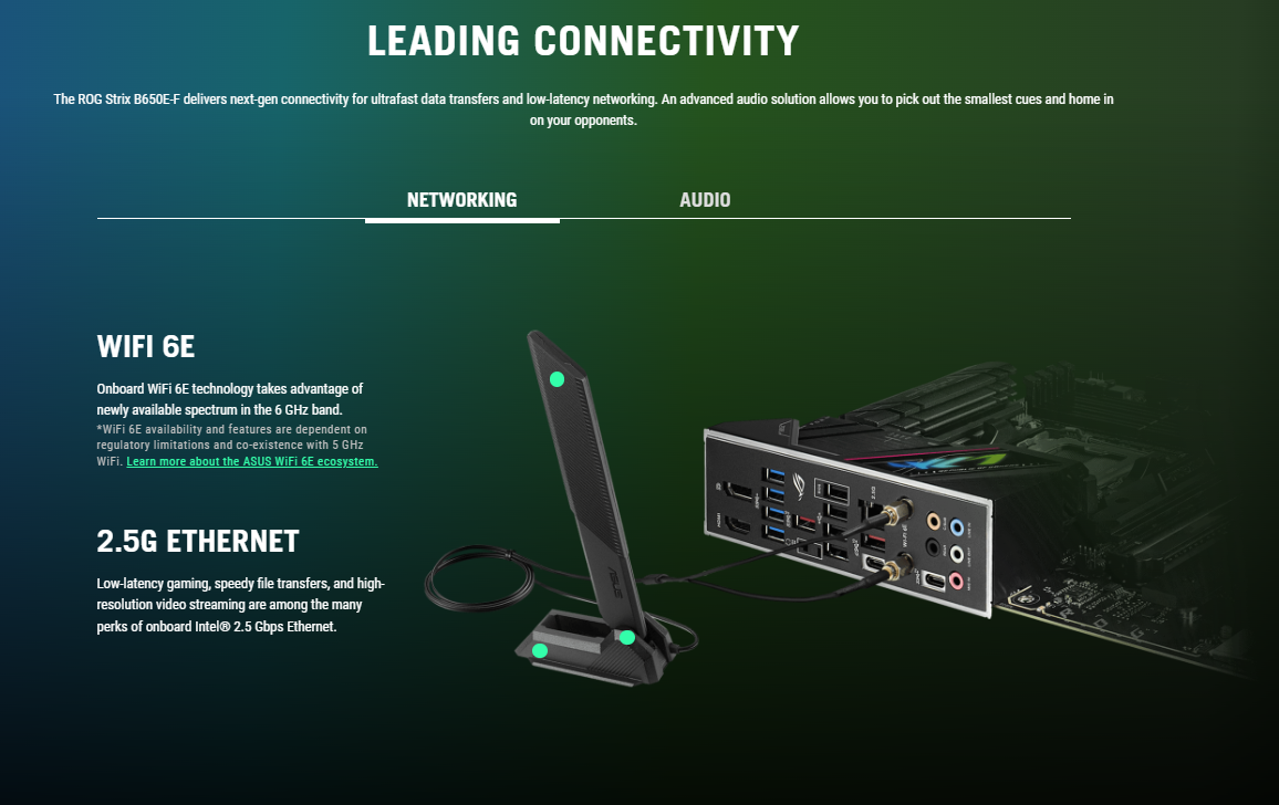 Wi-Fi 6E 2×2 Wi-Fi 6E (802.11 a/b/g/n/ac/ax) Supports 2.4/5GHz frequency band Bluetooth v5.2 * Wi-Fi 6E 6GHz regulatory may vary between countries, and function will be ready in Windows 11 or later.