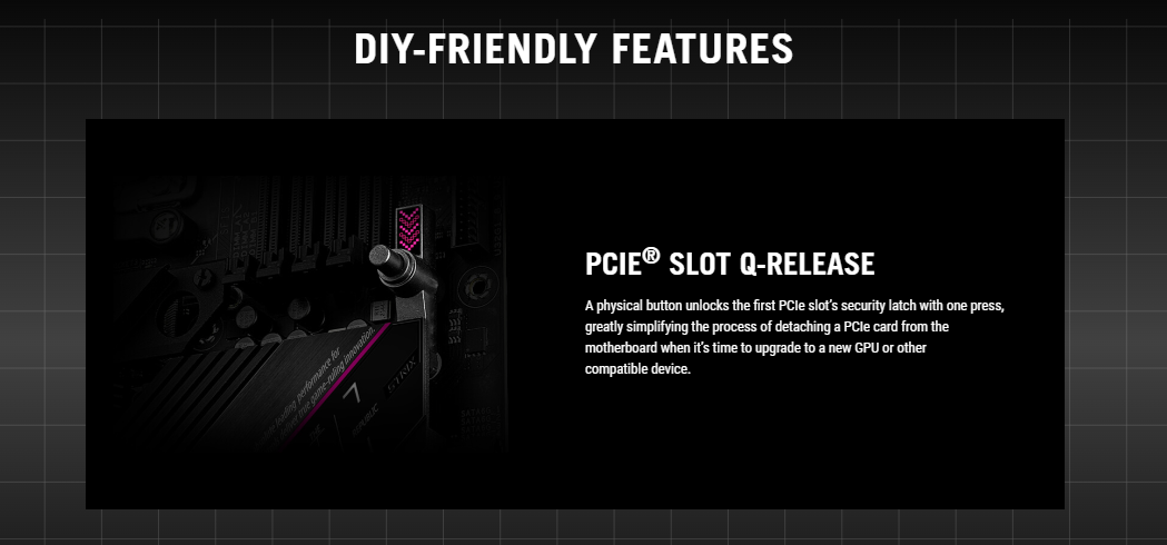 Extreme Engine Digi+ – 5K Black Metallic Capacitors ASUS Q-Design – M.2 Q-Latch – PCIe Slot Q-Release – Q-LED – Q-DIMM – Q-Slot ASUS Thermal Solution – M.2 heatsink – VRM heatsink design ASUS EZ DIY – BIOS FlashBack™ button – BIOS FlashBack™ LED – ProCool – Pre-mounted I/O shield – SafeSlot – SafeDIMM AURA Sync – AURA RGB header – Addressable Gen 2 headers
