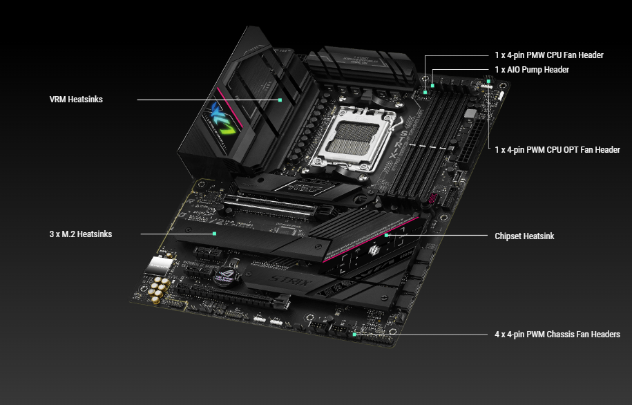 Fan and Cooling related 1 x 4-pin CPU Fan header 1 x 4-pin CPU OPT Fan header 1 x 4-pin AIO Pump header 4 x 4-pin Chassis Fan headers Power related 1 x 24-pin Main Power connector 1 x 8-pin +12V Power connector 1 x 4-pin +12V Power connector Storage related 3 x M.2 slots (Key M) 4 x SATA 6Gb/s ports USB 1 x USB 3.2 Gen 2 connector (supports USB Type-C®) 1 x USB 3.2 Gen 1 header supports additional 2 USB 3.2 Gen 1 ports 2 x USB 2.0 headers supports additional 4 USB 2.0 ports Miscellaneous 3 x Addressable Gen 2 headers 1 x AURA RGB header 1 x Clear CMOS header 1 x CPU Over Voltage jumper 1 x Front Panel Audio header (AAFP) 1 x S/PDIF Out header 1 x 20-3 pin System Panel header with Chassis intrude function 1 x Thermal Sensor header 1 x Thunderbolt™header 1 x COM_DEBUGheader