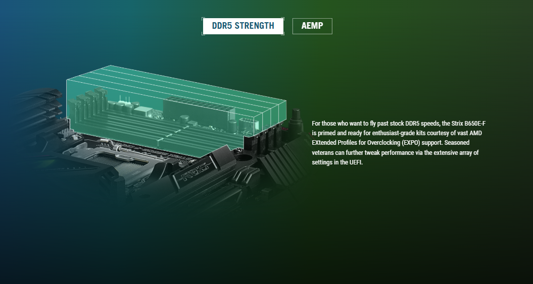 4 x DIMM, Max. 192GB, DDR5 8000+(OC)/7800(OC)/7600(OC)/7200(OC)/7000(OC)/6800(OC)/6600(OC)/6400(OC)/ 6200(OC)/ 6000(OC)/ 5800(OC)/ 5600(OC)/ 5400(OC)/ 5200/ 5000/ 4800 ECC and Non-ECC, Un-buffered Memory* Dual Channel Memory Architecture Supports AMD EXTended Profiles for Overclocking (EXPO™) OptiMem II * Supported memory types, data rate(Speed), and number of DRAM module vary depending on the CPU and memory configuration, for more information refer to www.asus.com for memory support list.